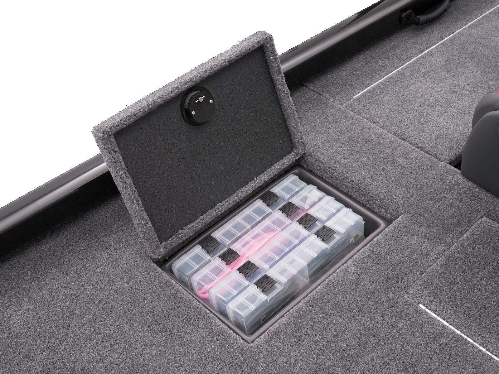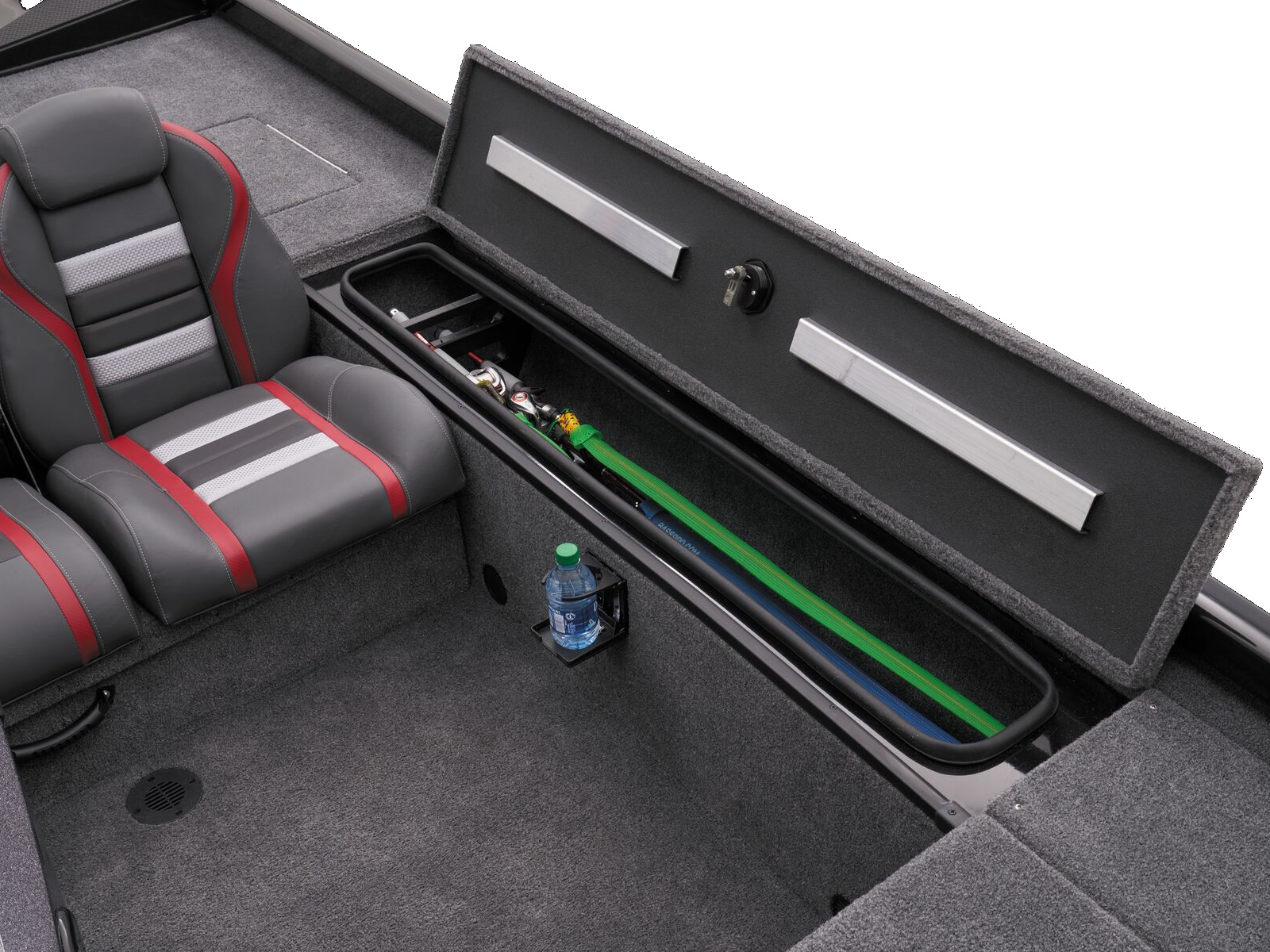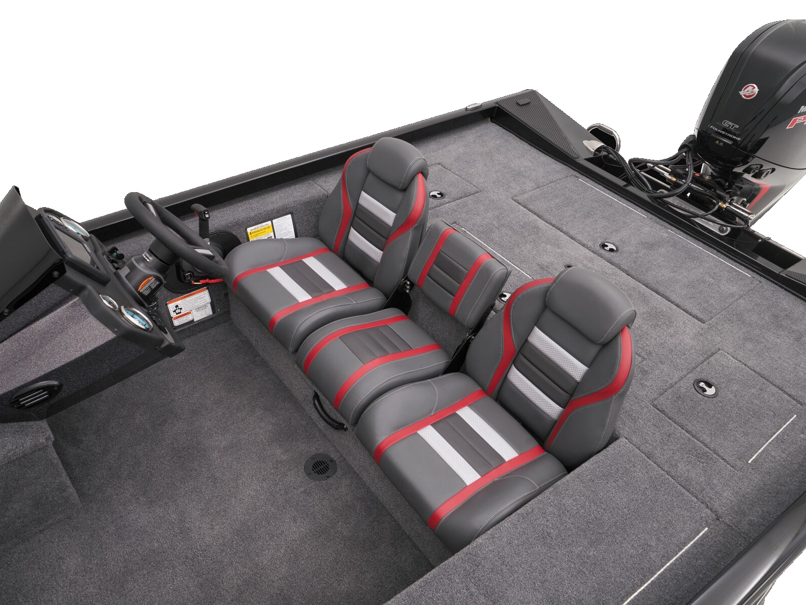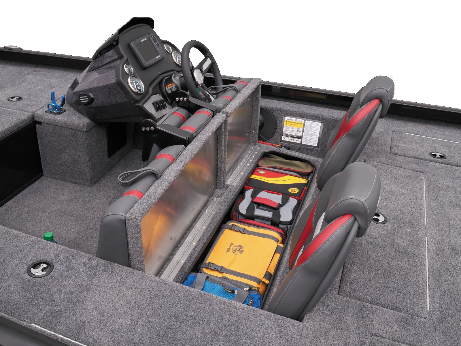 - Custom fitted marine upholstery- driver/passenger bucket seating w/ center fold down & two matching fishing seats