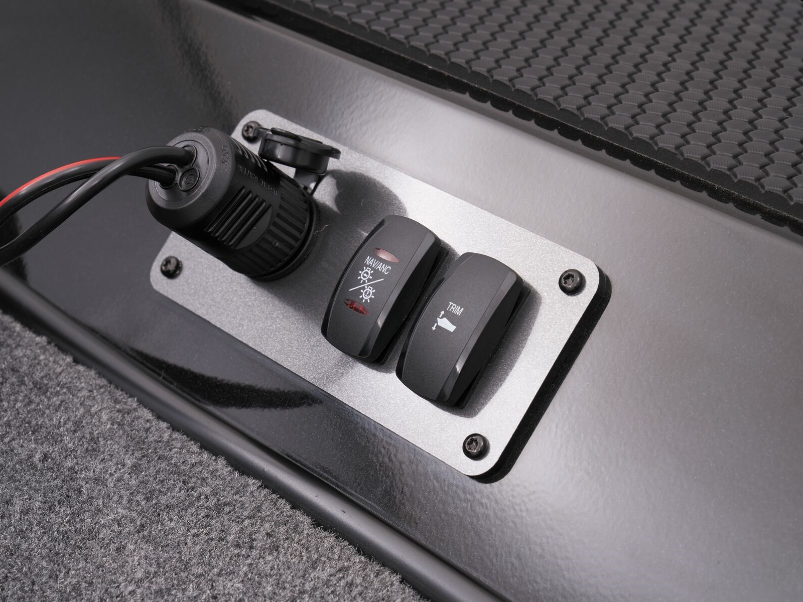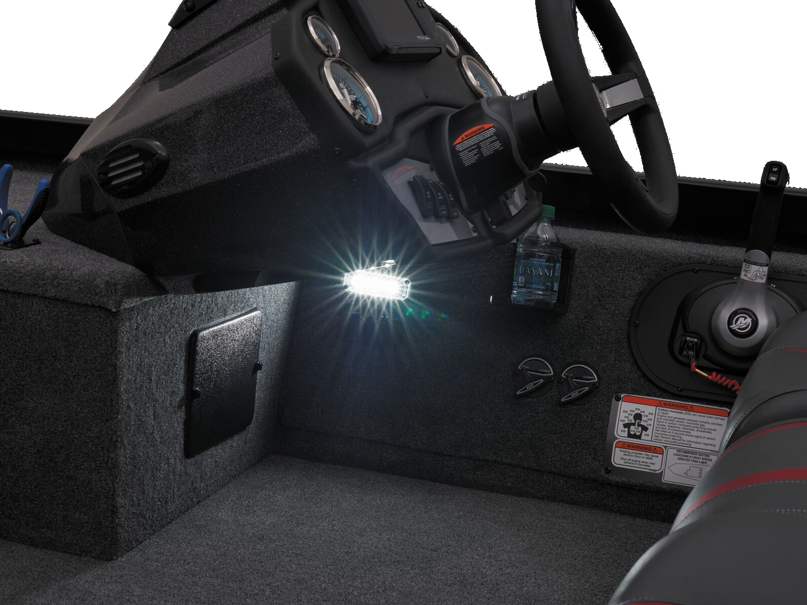 - Custom fiberglass console w/ flush-mounted depthfinder, tach, speed, fuel, trim gauge & easy touch switching