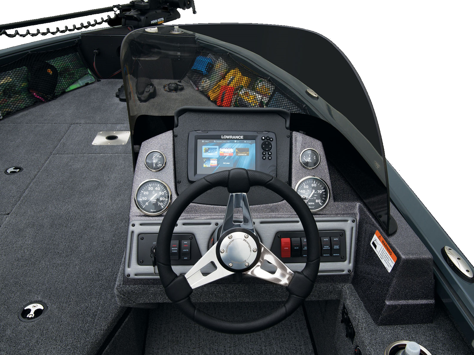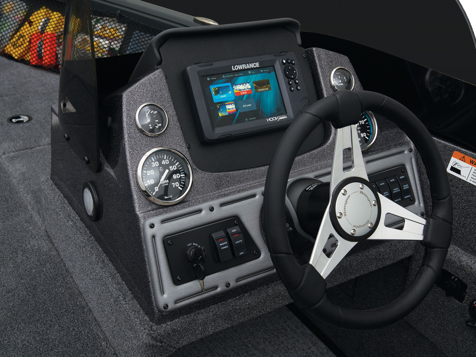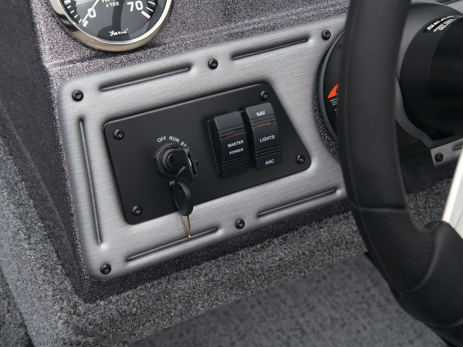 - Custom fiberglass console w/ flush mounted depthfinder, tach, speed, fuel, trim gauges & easy touch switching
