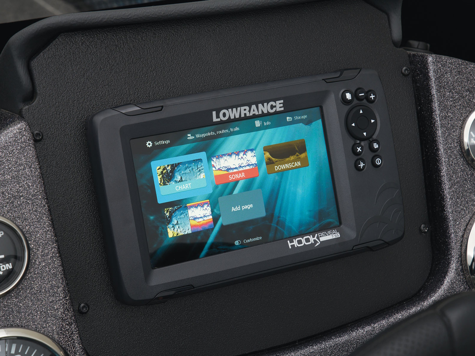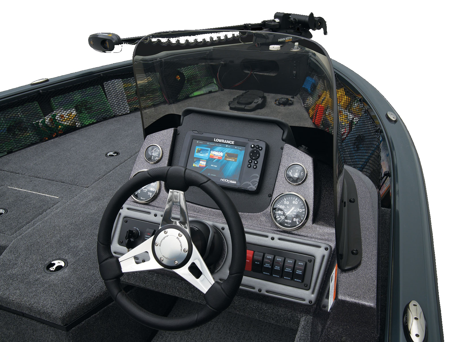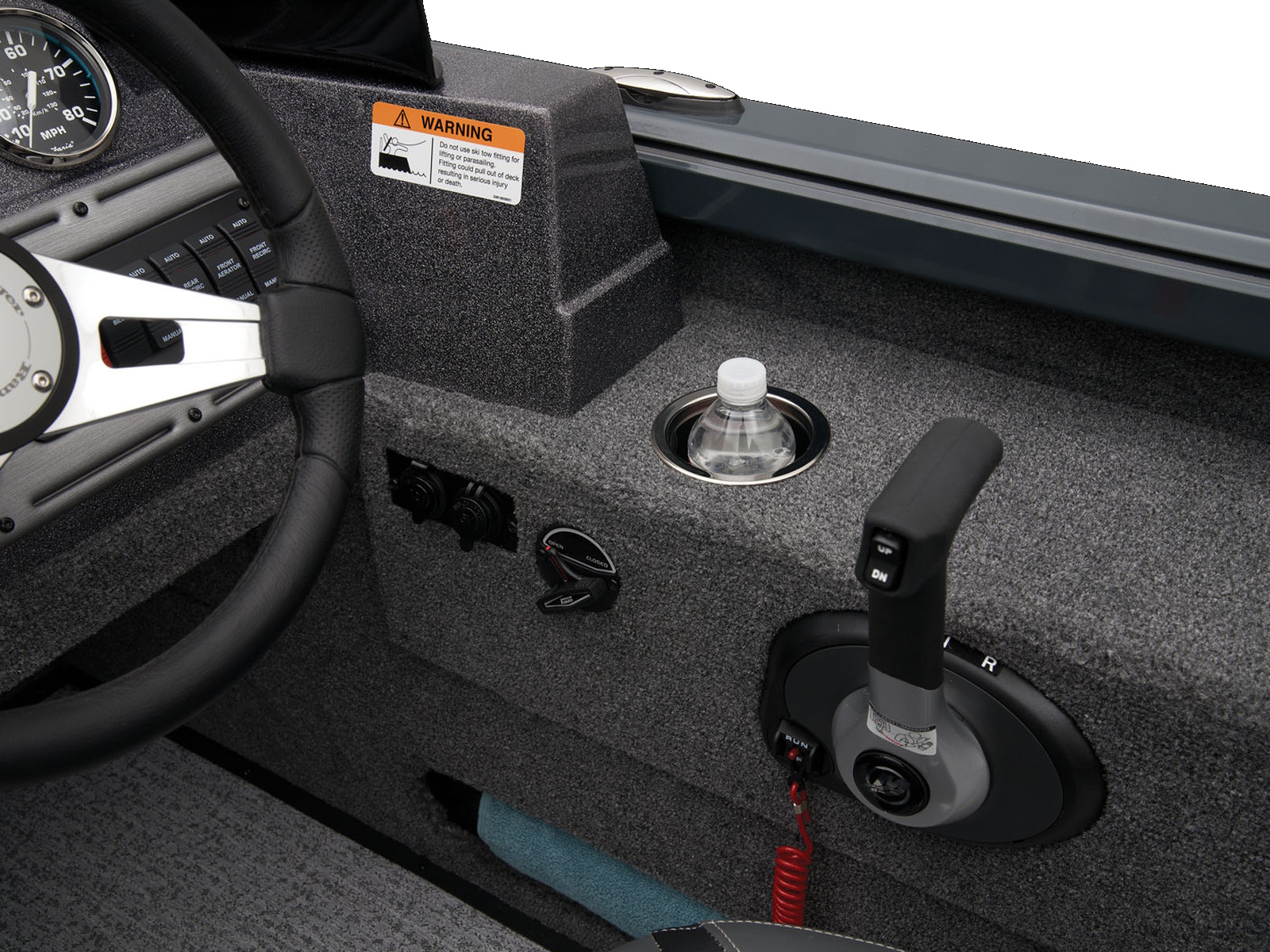 - Custom fiberglass console w/ flush mounted depthfinder, tach, speed, fuel, trim gauges & easy touch switching