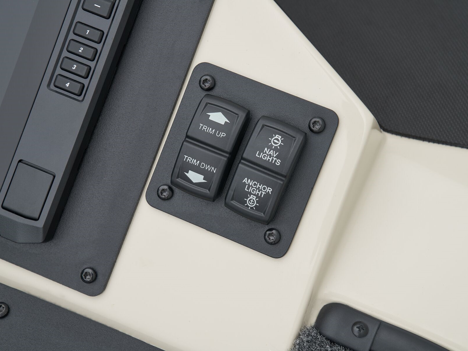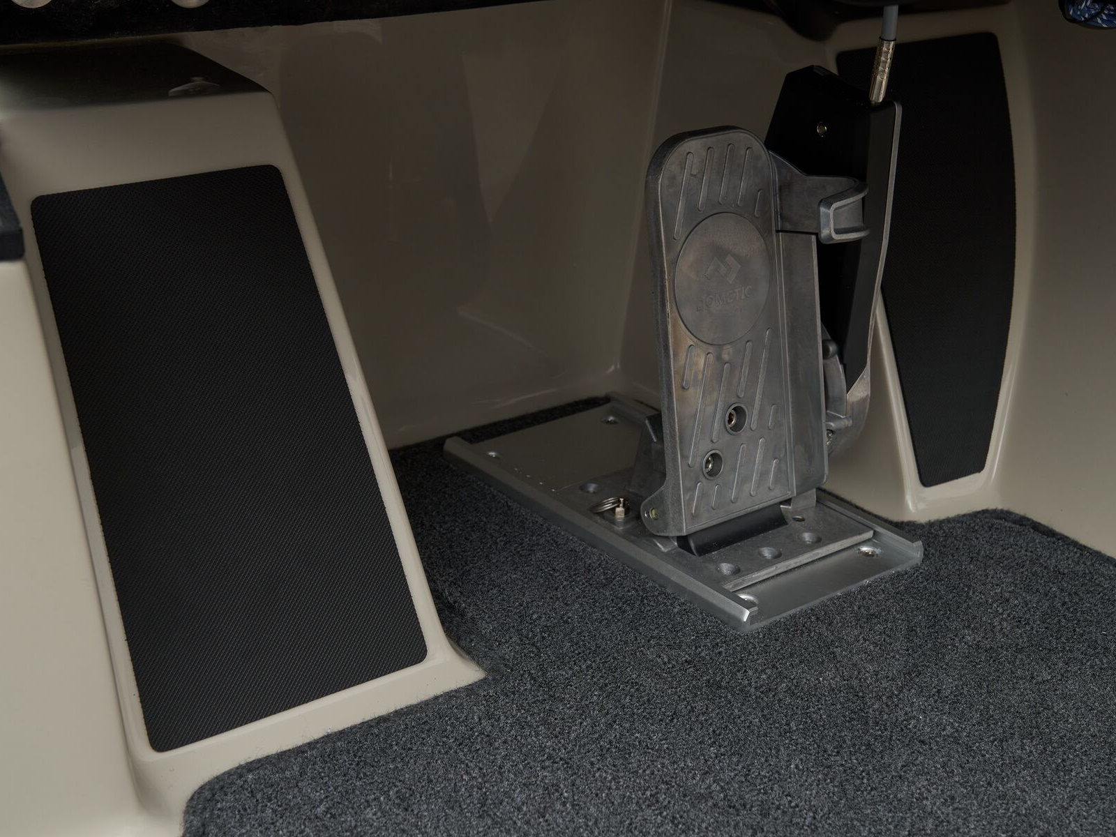 - Custom-fitted premium marine upholstery (2) Soft Ride Seating (SRS) bucket seats, (1) bike seat with Pro Pole, (1) SRS fold-down with power pedestal