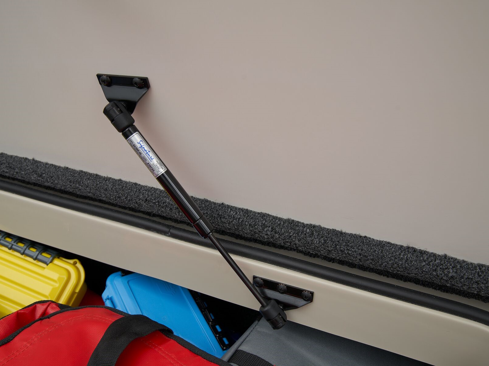 - Lockable storage compartments, dual rod boxes with gas spring lid assists