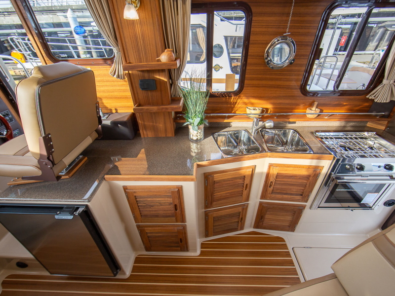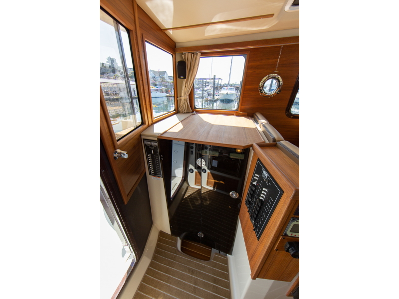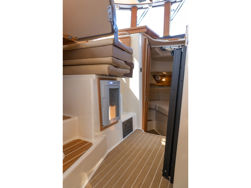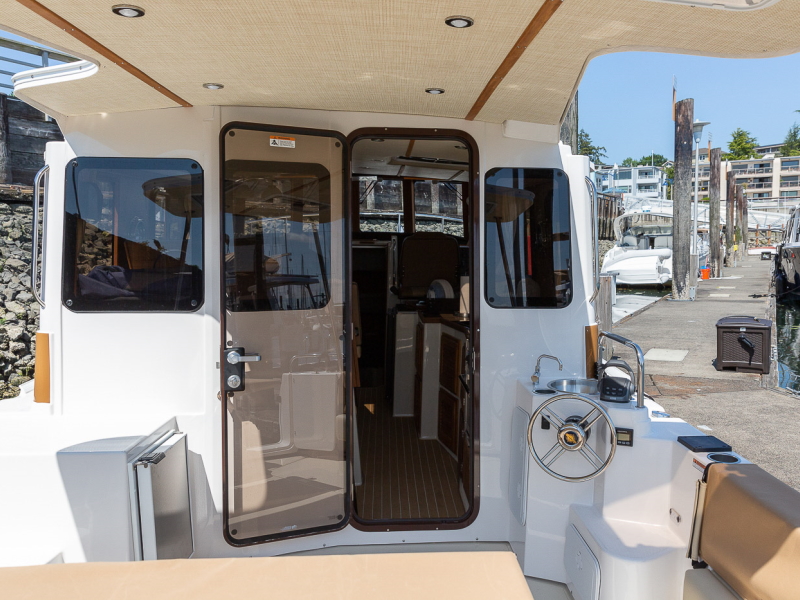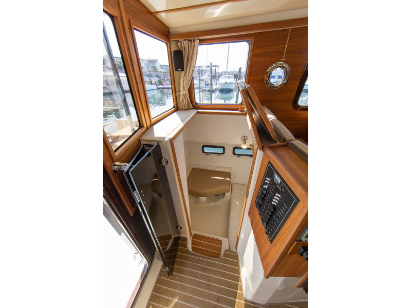 The interior layout of the R-31 S features two staterooms—one large island berth forward with en suite head and a midship berth and day head. Those who are familiar with Ranger Tugs models will recognize the galley layout and helm station that maximize interior space. A starboard side door provides easy access from the helm to the side decks so crew can get to the bow for line handling.