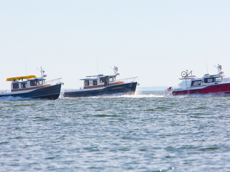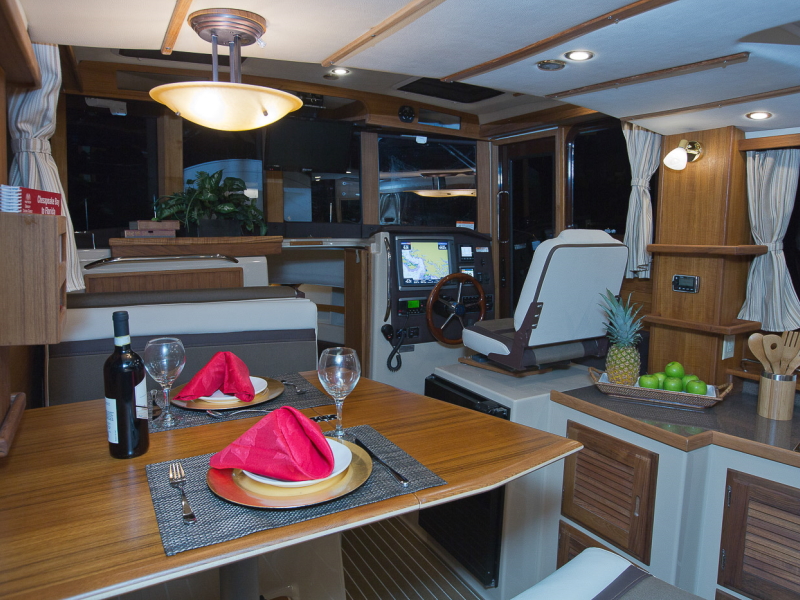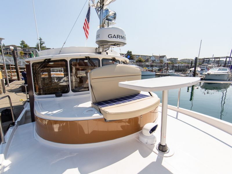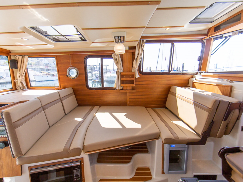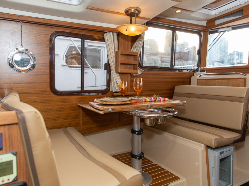 The R-31 S shares many of the features and qualities of her smaller sisterships but some notable additions to this larger model make her ideal for extended cruising while still being a trailerable trawler. The builders at Ranger Tugs equipped the foredeck with seating and a table that can be raised or lowered depending on whether the boat is under way or at anchor or dock for entertaining.