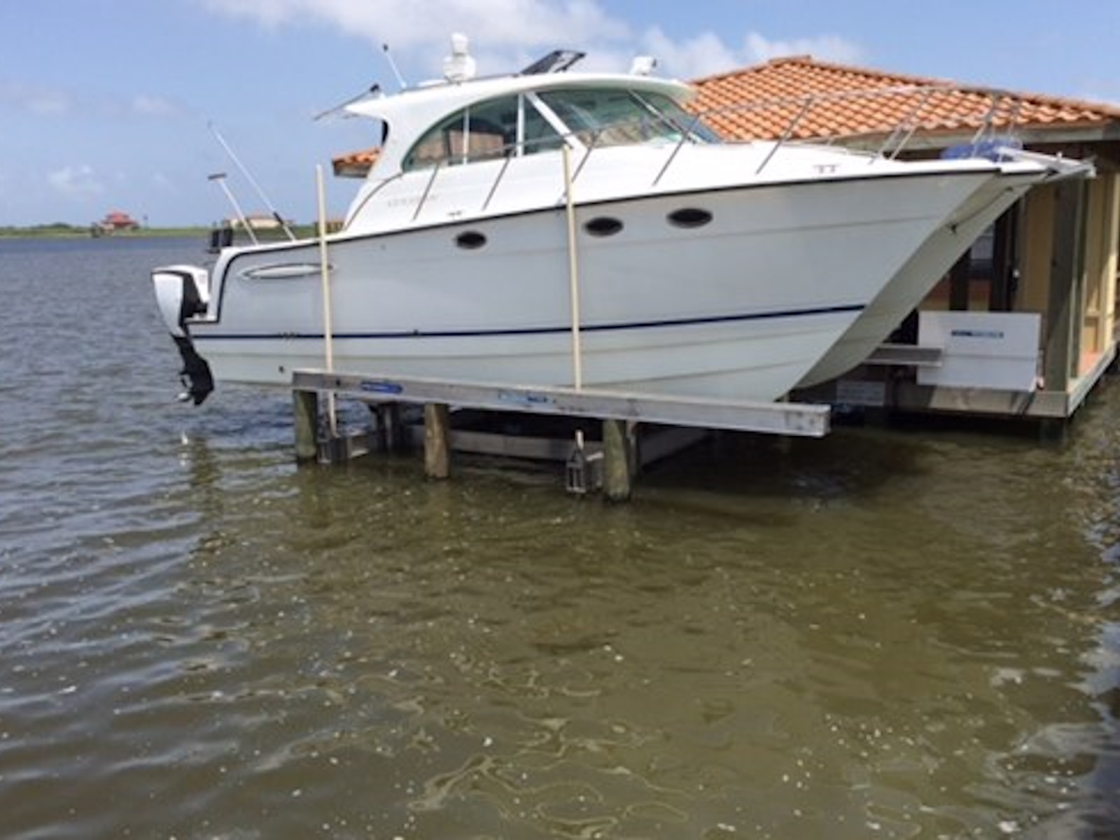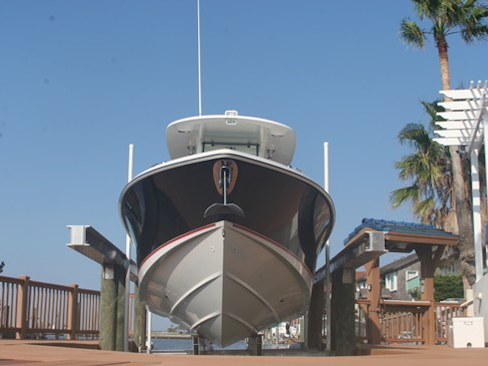 Enjoy the speed and convenience of our dual-cylinder Hydraulic boat lifts with this pile mount application. Our unique above-the-water hydraulic design allows you to get creative so your shorestyle complements your lifestyle. Install high for tidal fluctuation, deck level for a low profile look, or deck over the platform. Hang it from the ceiling, hide it in the roof or mount it under the deck.