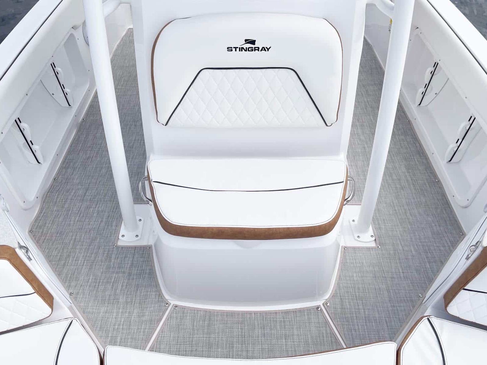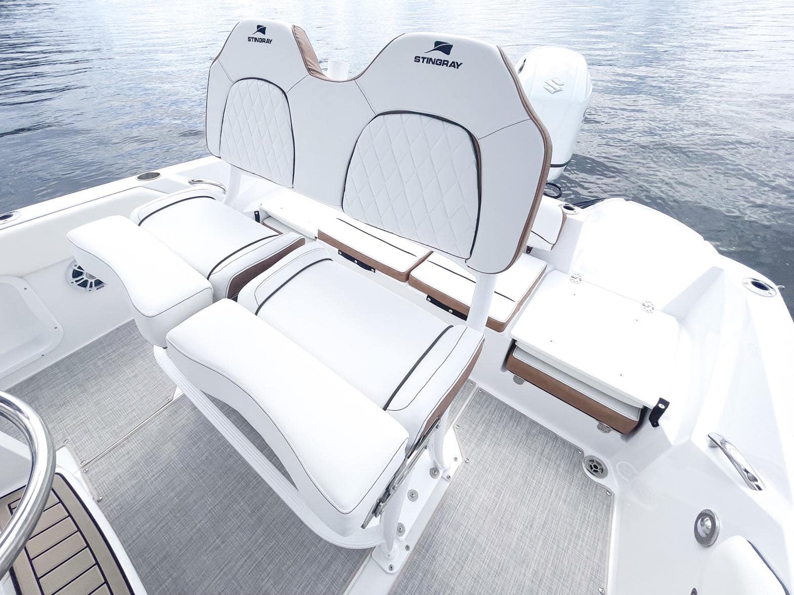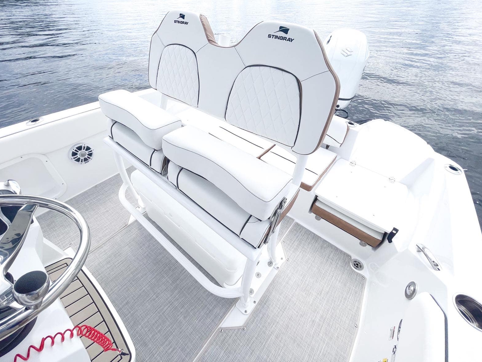 For a day out with the family, it offers lots of space for maneuvering about, plus seating for nine passengers. To ensure that none of the deck area is cluttered when headed out for a day on the water, STINGRAY designers effectively made use of all the space on board to incorporate lots of storage areas around the boat. Beneath the helm is a large area that can be used as a changing compartment and also upgraded to a head compartment with the addition of the optional porta potti. The two rear flip-down seats make it easy for your passengers to enter and exit the boat from either port or starboard.