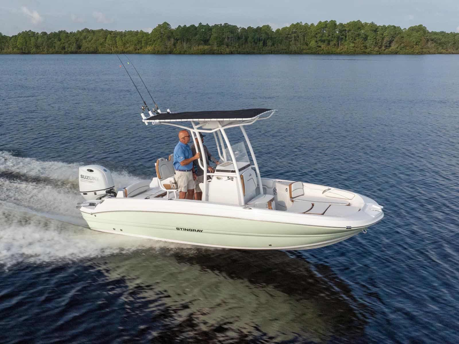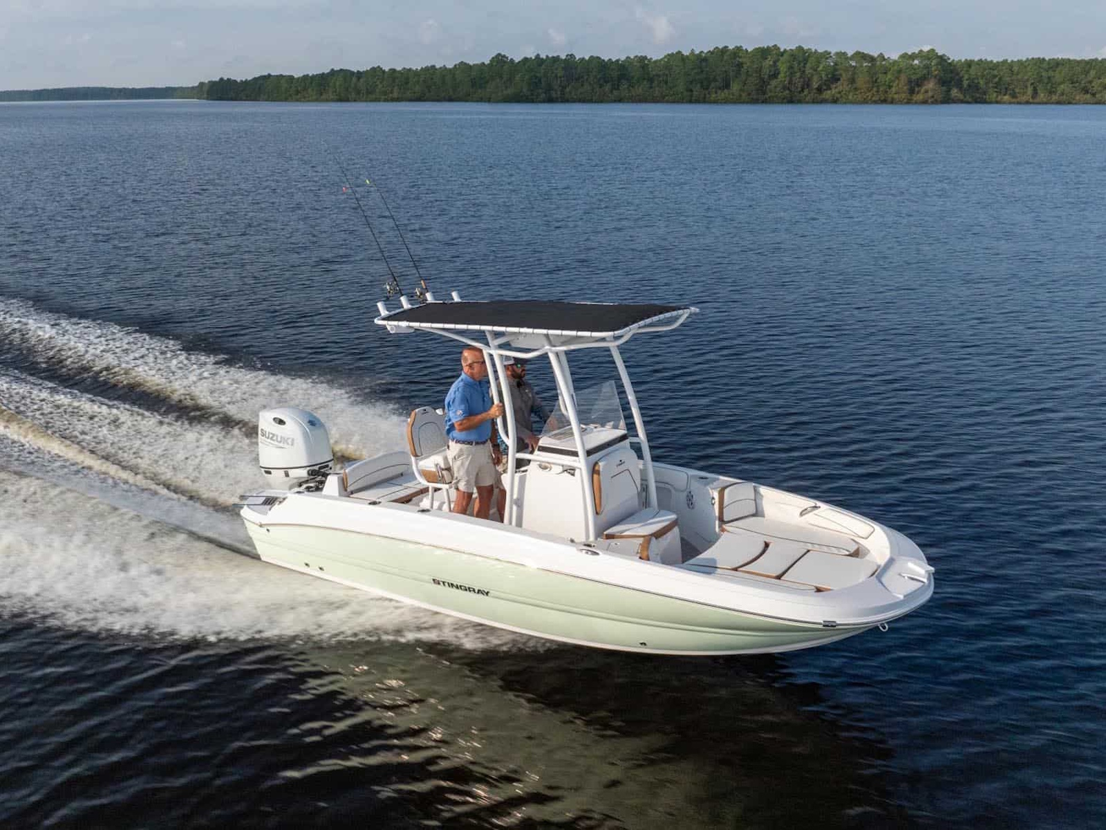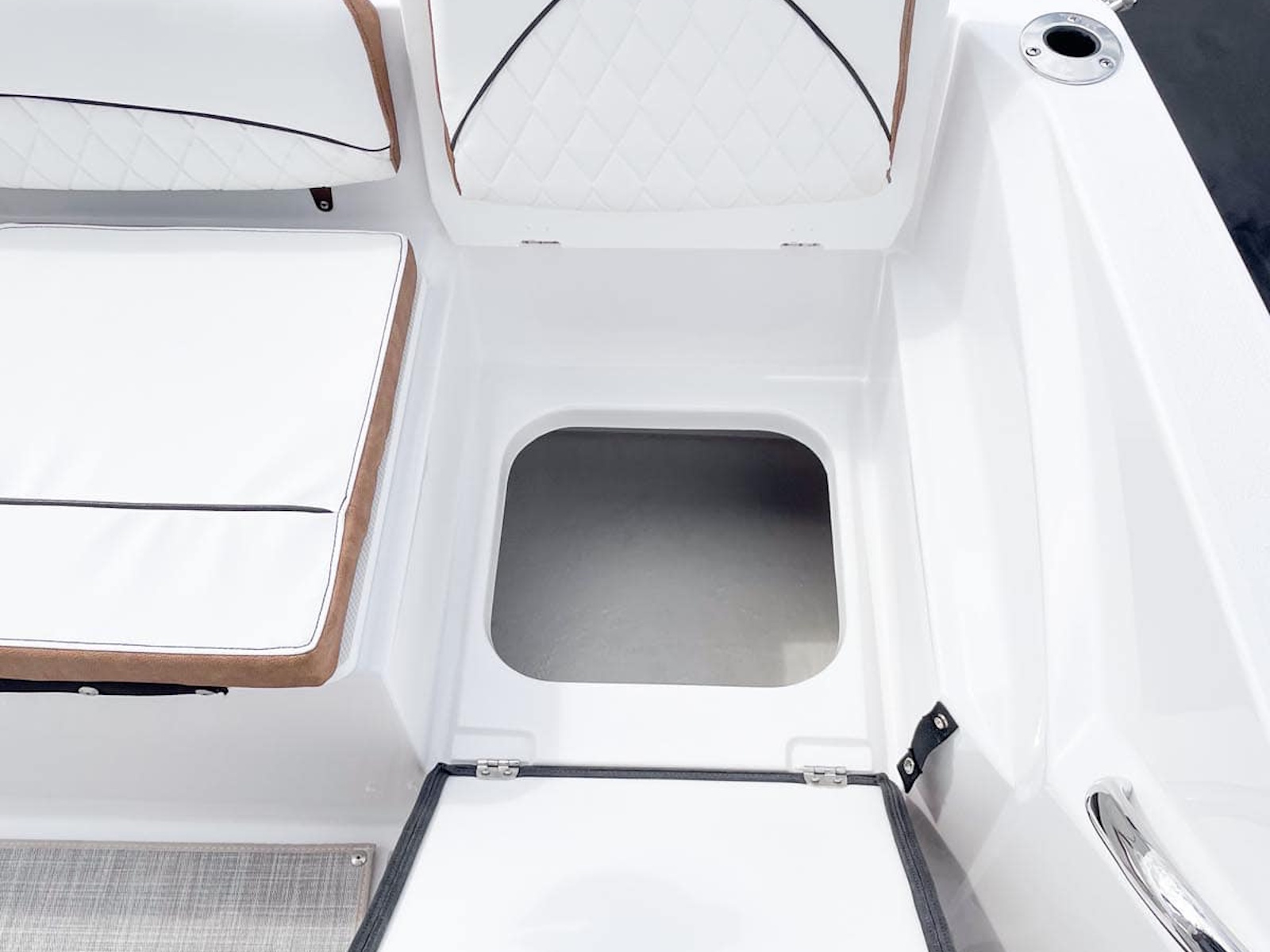 For a day out with the family, it offers lots of space for maneuvering about, plus seating for nine passengers. To ensure that none of the deck area is cluttered when headed out for a day on the water, STINGRAY designers effectively made use of all the space on board to incorporate lots of storage areas around the boat. Beneath the helm is a large area that can be used as a changing compartment and also upgraded to a head compartment with the addition of the optional porta potti. The two rear flip-down seats make it easy for your passengers to enter and exit the boat from either port or starboard.