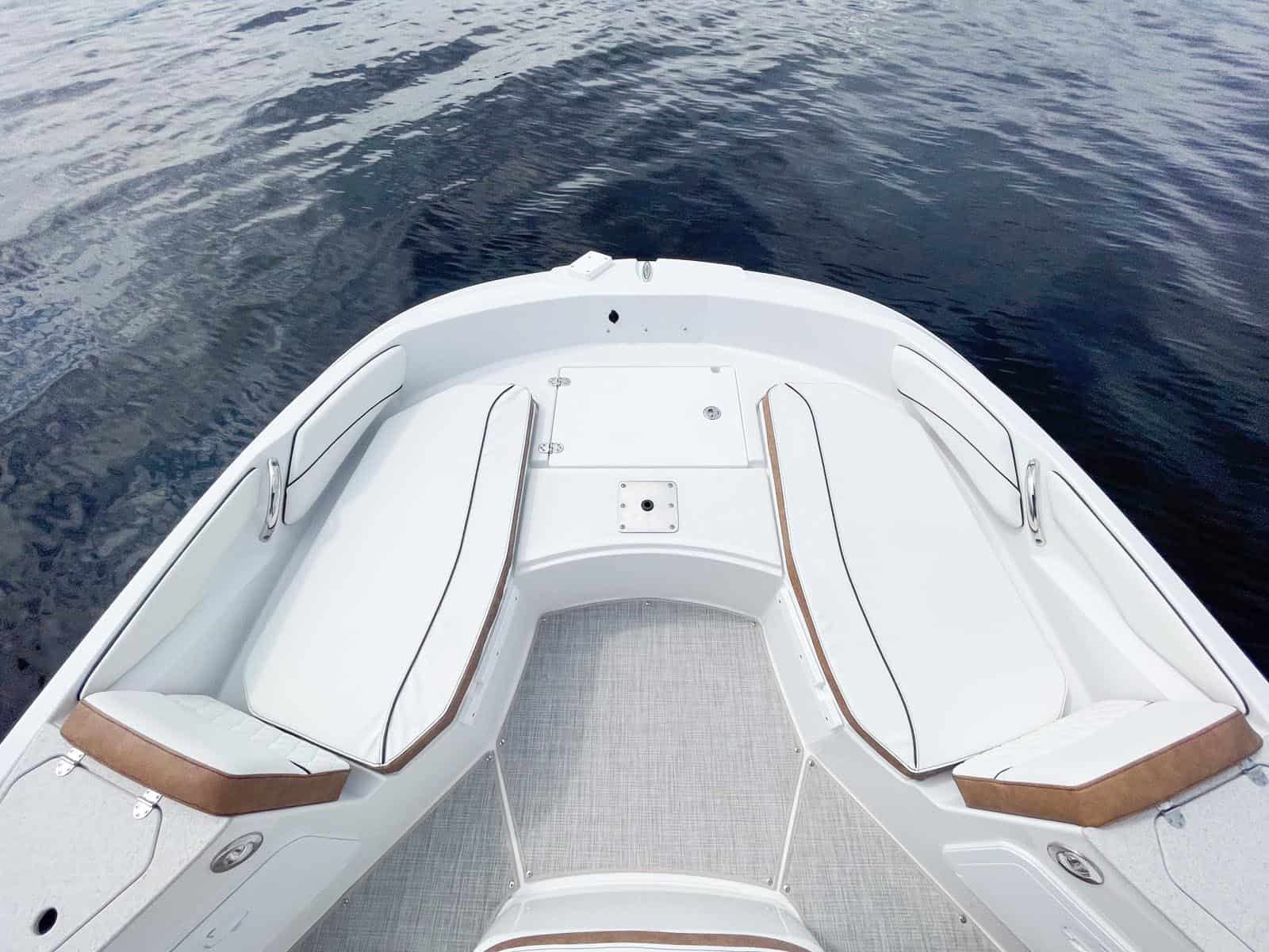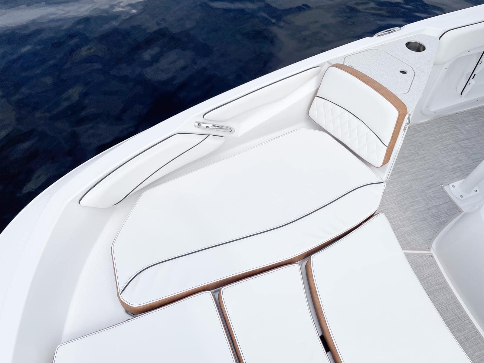 For the anglers, a low profile design makes it easy to navigate in low clearance areas, a helm seat for two has an adjustable seat / leaning post for fishing, a clean dash design leaves room for GARMIN electronics, the main helm seat lifts to reveal a conveniently located 26-gallon live well, and the forward bench offers an 18-gallon cooler that can be upgraded to a live well. The walk-around access, combined with the large foredeck, makes it easy for anglers to quickly move around the boat. Additionally, two rear seats lift up for seating and quickly fold down for use as casting platforms. Fishing rods are easily accessible thanks to abundant rod storage on both sides of the boat.