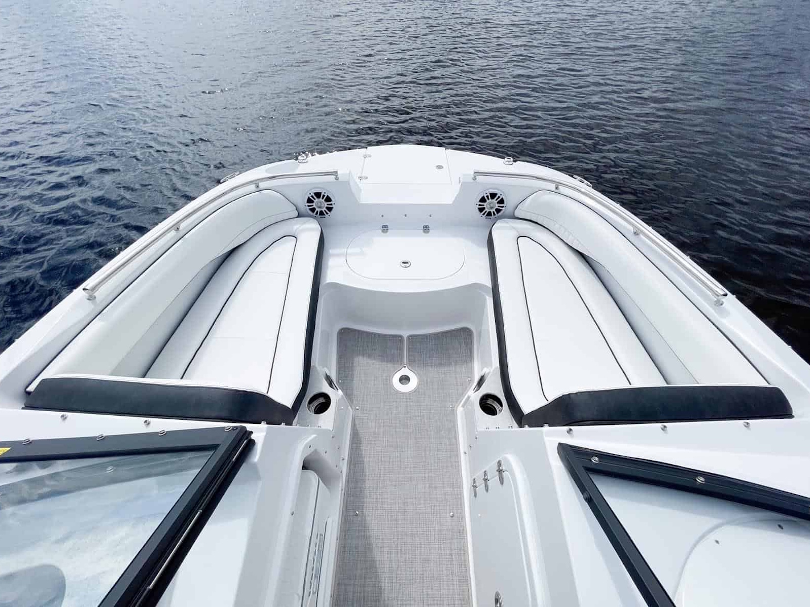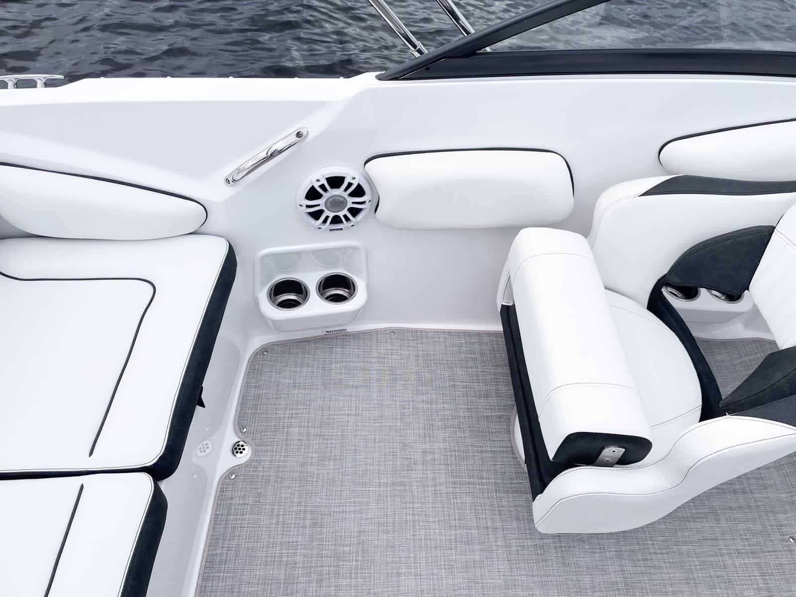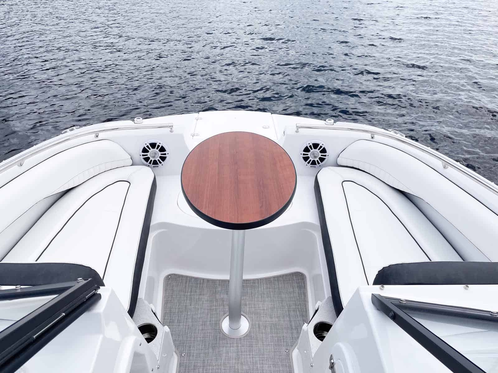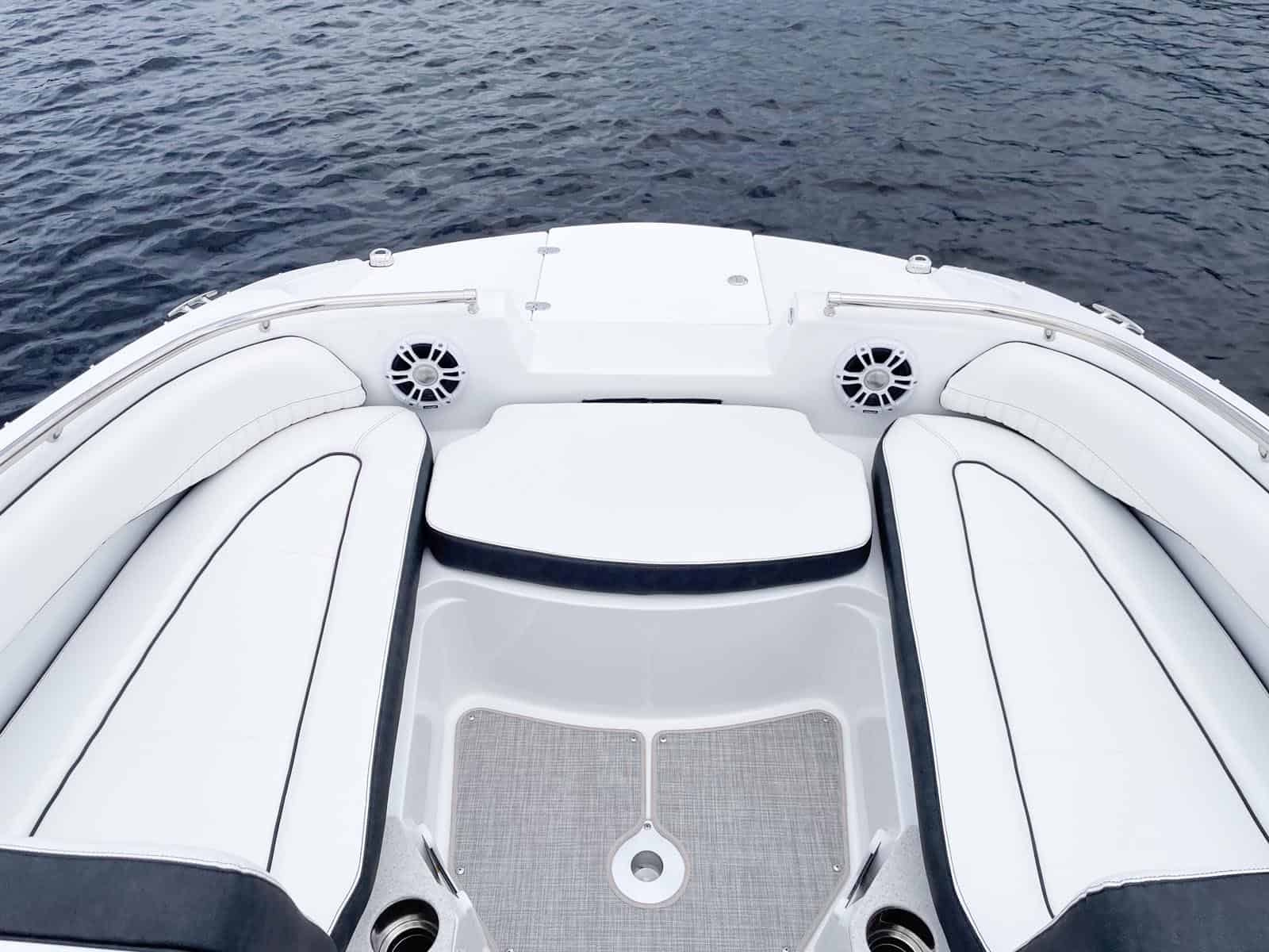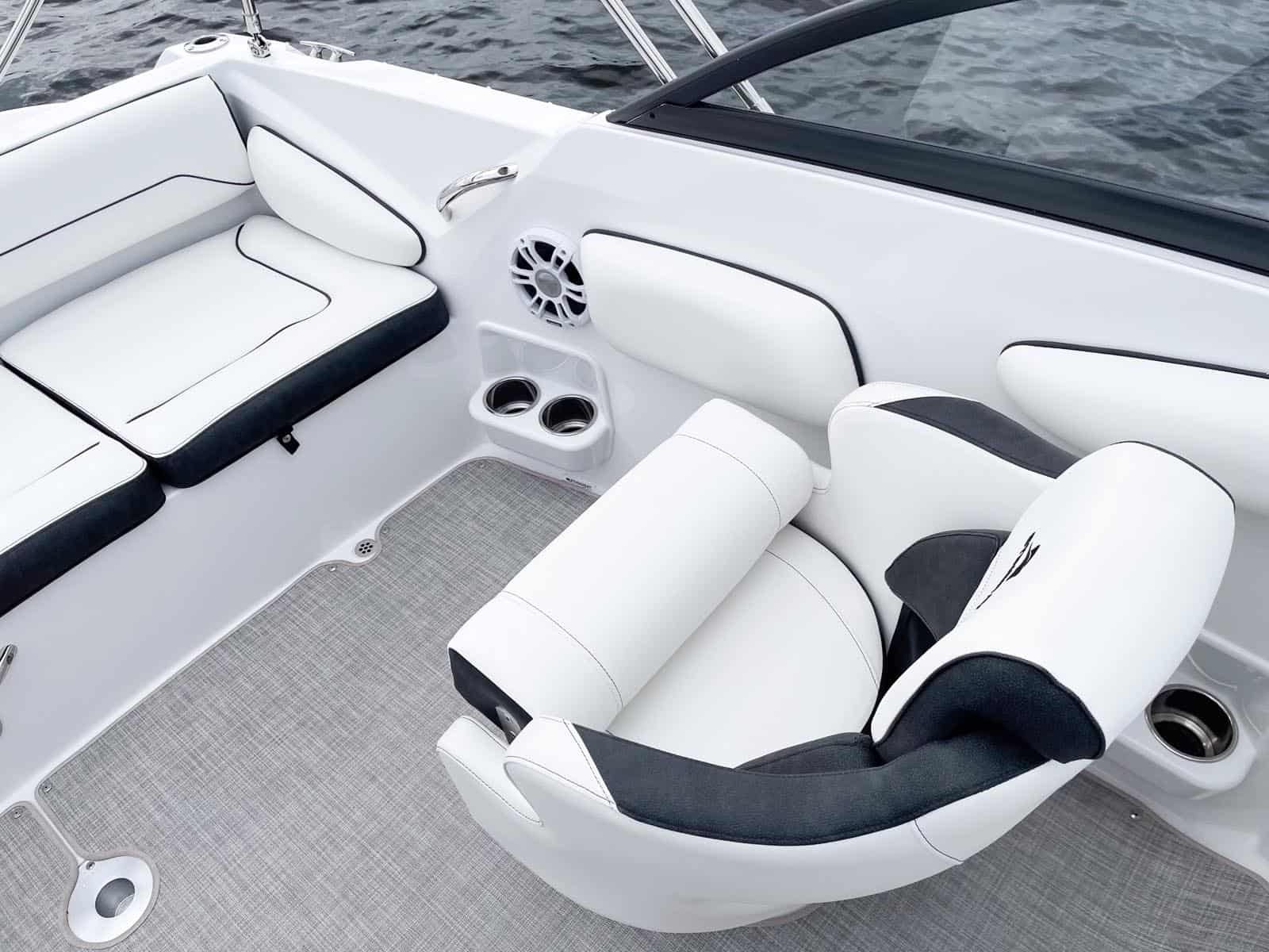 If you love the open feel of a deck boat, but like your boat to have a full windshield, you shouldn't have to choose. The 201DC Dual Console gives you all the interior room and storage space of our 192SC and the added full wrap-around windshield provides a nice shield from the wind while underway. This version gives you two sport bucket seats with bolsters. Deep cockpit and bow areas provide extra safety and security for your passengers. Behind the captain is a solid-surface countertop with a sink and faucet. A mix of dual console deck boat and traditional runabout seating works together to give you a roomy boat with seating for up to 10 passengers.