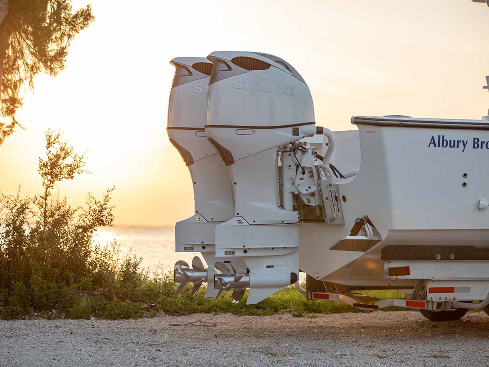 The new DF300BMD Integrated steering is the newest addition to the Suzuki lineup. The Suzuki Dual Propeller System and the Suzuki 2-Stage Gear Reduction aid to successfully produce better torque for all types of boat applications. The new DF300BMD has been engineered to run on 87 octane fuel, has integrated steering for easier rigging and a newly updated lower unit. This truly is Suzuki’s ultimate Four-Stroke Outboard Motor. Now available in Cool White and Pearl Nebular Black.