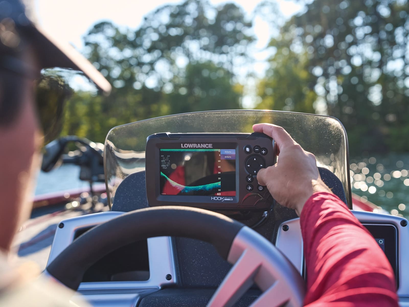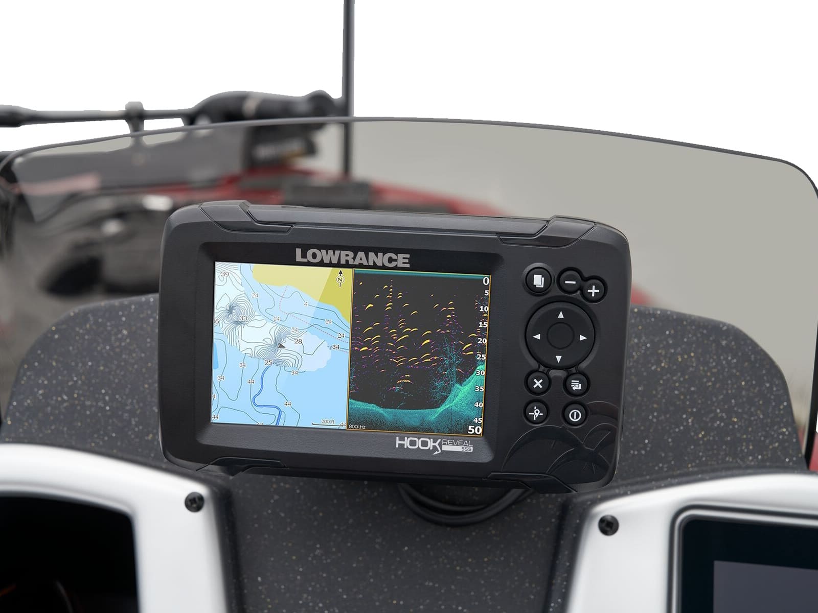 - Bow Lowrance® HOOK Reveal 5 swivel color fishfinder + GPS w/CHIRP & SplitShot™ transducer