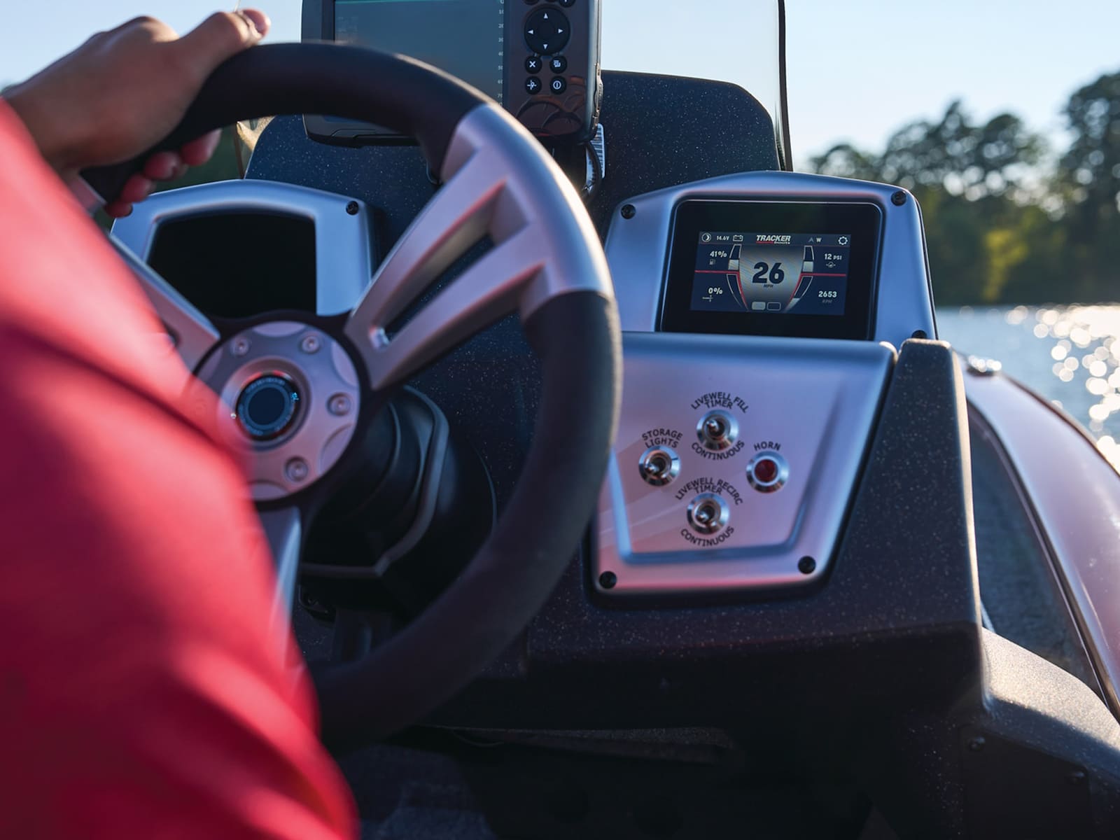 - NEW 1-piece rotomolded TRACKER® console w/built-in controls, storage pocket & windscreen