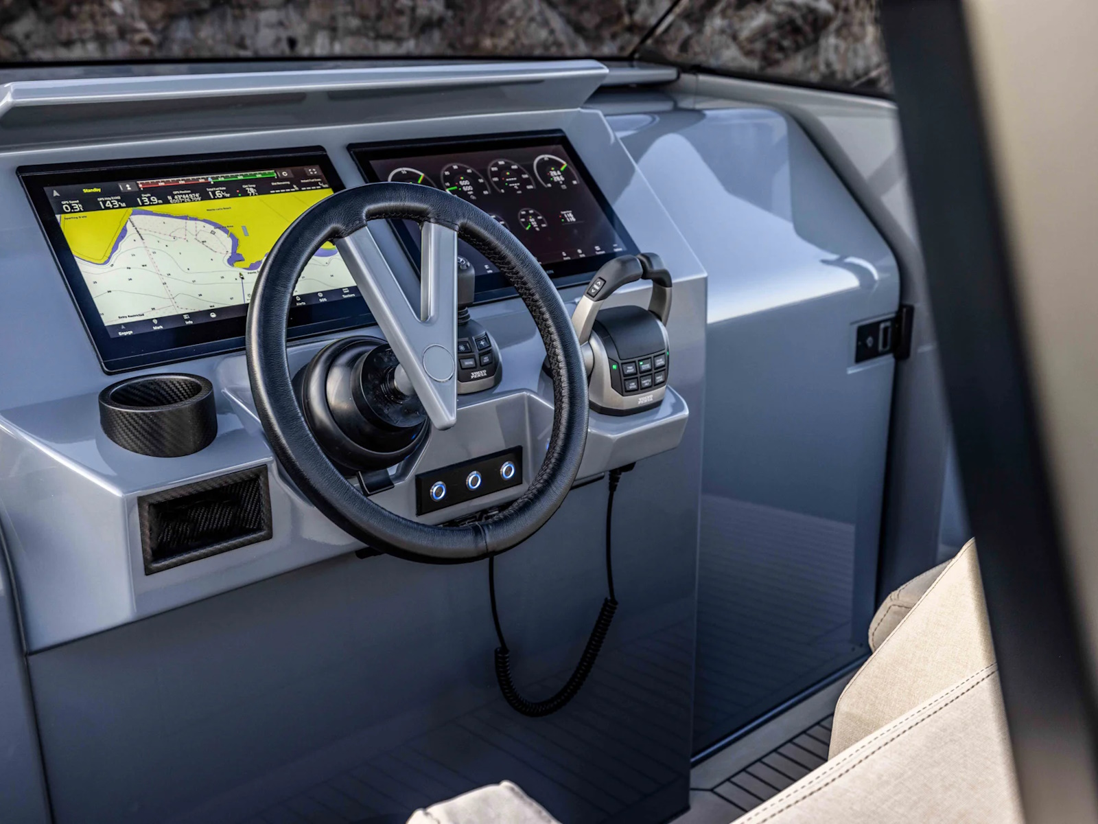 Behind the helm seats is a groovy outdoor-galley area with corian countertop, sink, wine cooler/fridge, optional icemaker, and a smart storage locker for cutlery, plates and glassware. The low draught increases access to smaller harbours, another reason why the VQ40 Sports Line is ideal for chartering too. Your choice of use will reflect what you do below decks, where you can opt to fit anything from a queen bed to a large kitchen, as well as a shower and toilet.