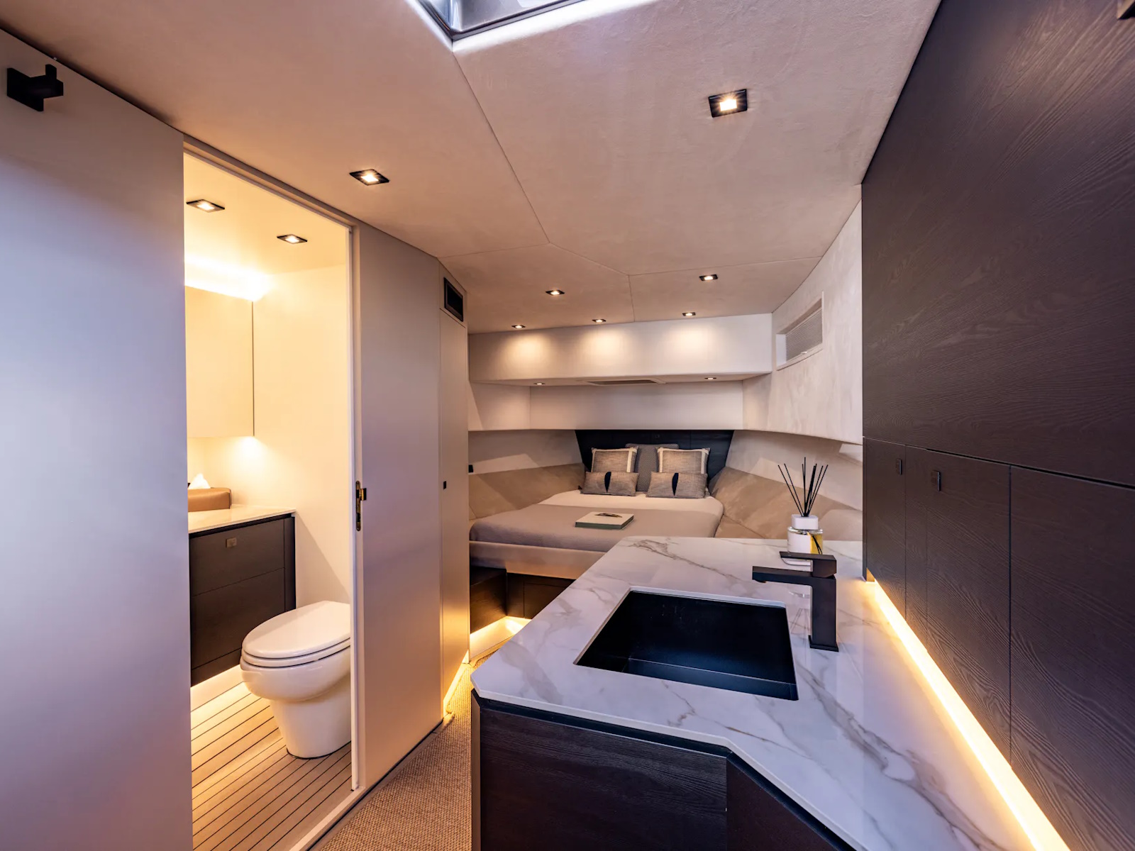 The multipurpose VQ45 is easy to manoeuvre thanks to her smart joystick steering and Volvo IPS system. A T-Top version is available with an integrated electric sunscreen and both the T-Top, as well as the hard top version, can be fitted with a hydraulic swim ladder and Seakeeper 6 zero speed stabilisers. There are even VQ45s which serve as a superyacht tender, with dedicated side-boarding doors making alighting from the mothership easy.