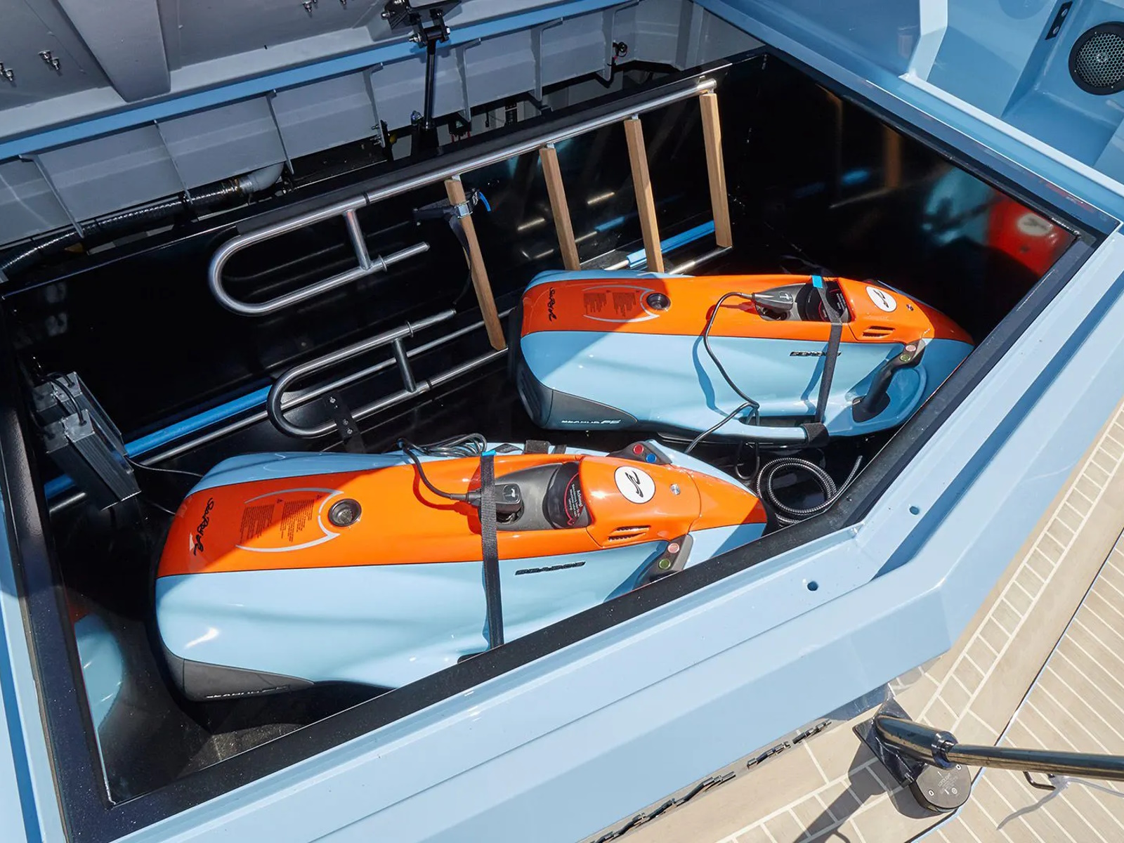 - The VQ45 makes the most of the adaptability of aluminium: as long as your design includes the trademark silhouette and 'wow' factor of a Vanquish, you can create a boat that precisely meets your needs. An extreme example is the incredible Robins Nest, launched in 2022 for a client looking to reach his favourite snorkelling grounds in record time. Four 600 hp Mercury Verado outboard engines did the trick with joystick and sky hook controls. This VQ45 carries two Sea Bobs, Segway Scooters and electric bikes, with an in-house designed automatic crane to get toys onto the dock/water. Two bespoke boarding doors, together with a hydraulic swim ladder/passerelle, make Robins Nest accessible for watersports as well as smooth boarding at waterside restaurants.