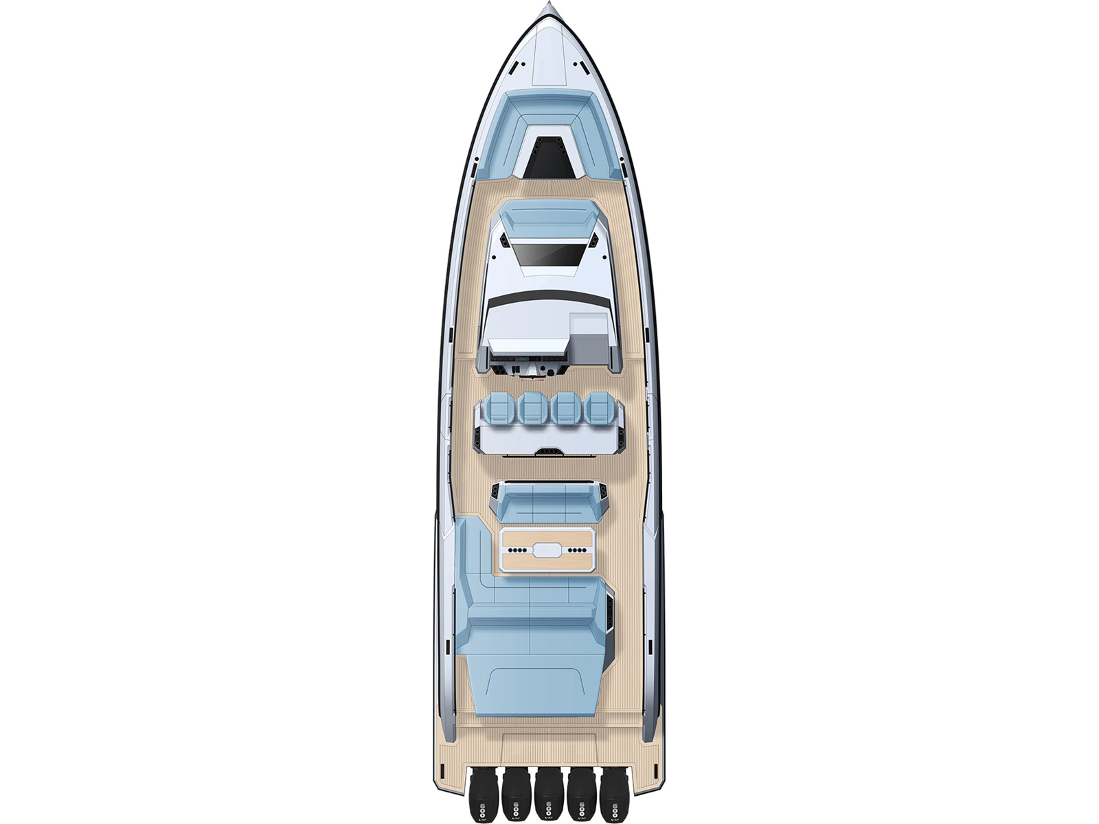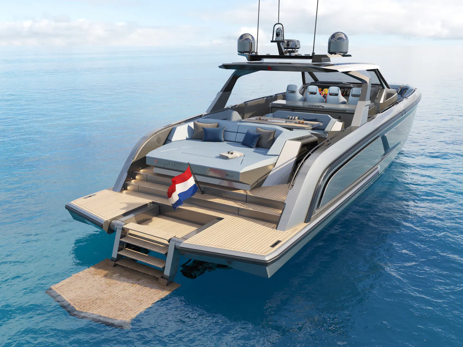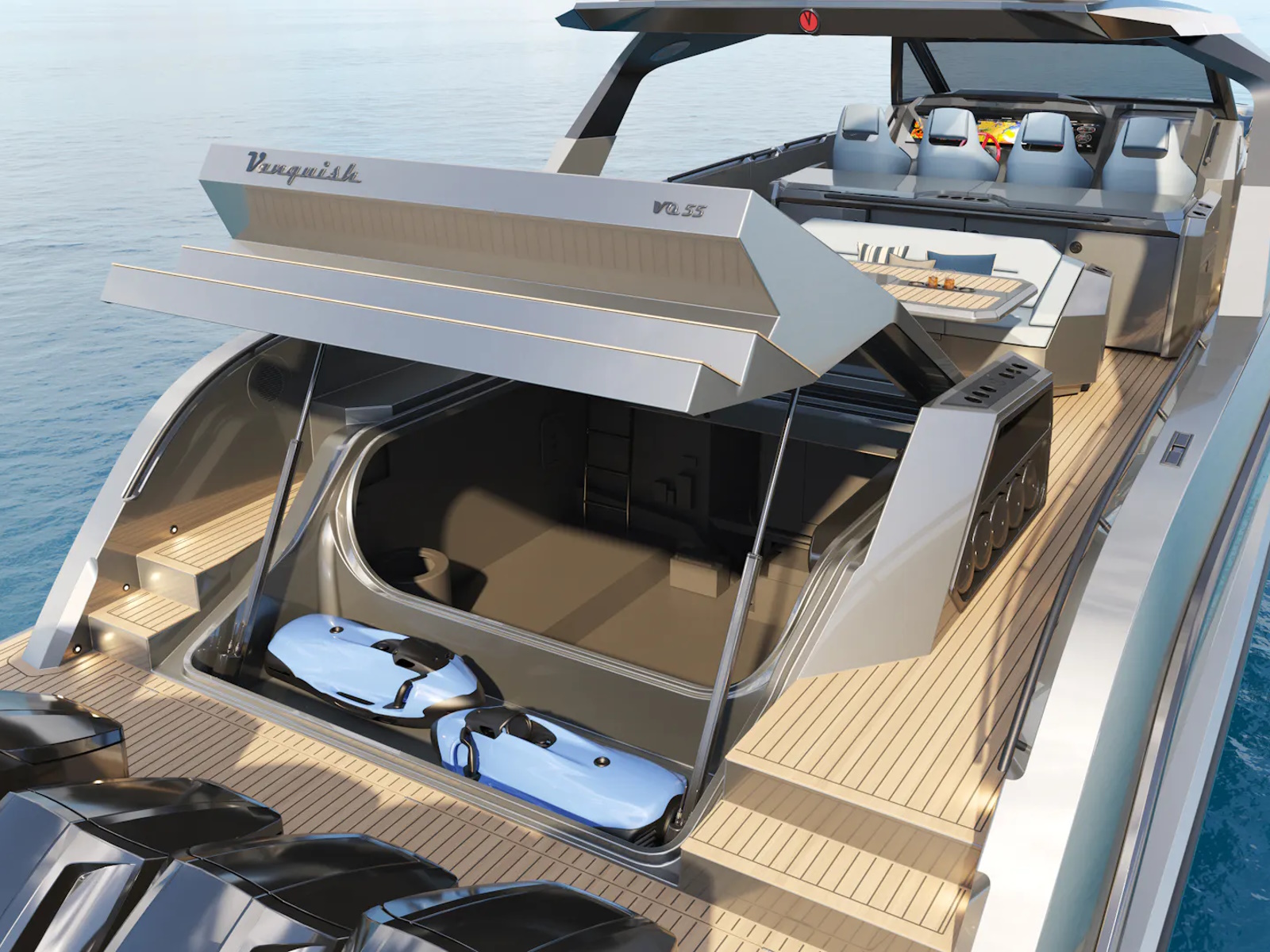 - Designer Guido de Groot and our engineers went to work on stretching the VQ40 to a VQ55, devising a sensational centre-console boat. Twin 1200 horsepower diesels with waterjets will have you riding the waves at 50+ knots and you’ll also be able to head into very shallow waters and beach up on the sand. Moreover, waterjets are also known to be the safest propulsion system for swimmers. In addition, the Vanquish developers are creating a stepped hull outboard version which we are developing mainly for the US and Middle East markets. This will open up the potential for a Veloce model and with four or five Mercury V12 600hp outboard engines your speed will be over 70 knots! There’s no other lifestyle sports yacht of this size that is capable of outperforming the VQ55’s speed.