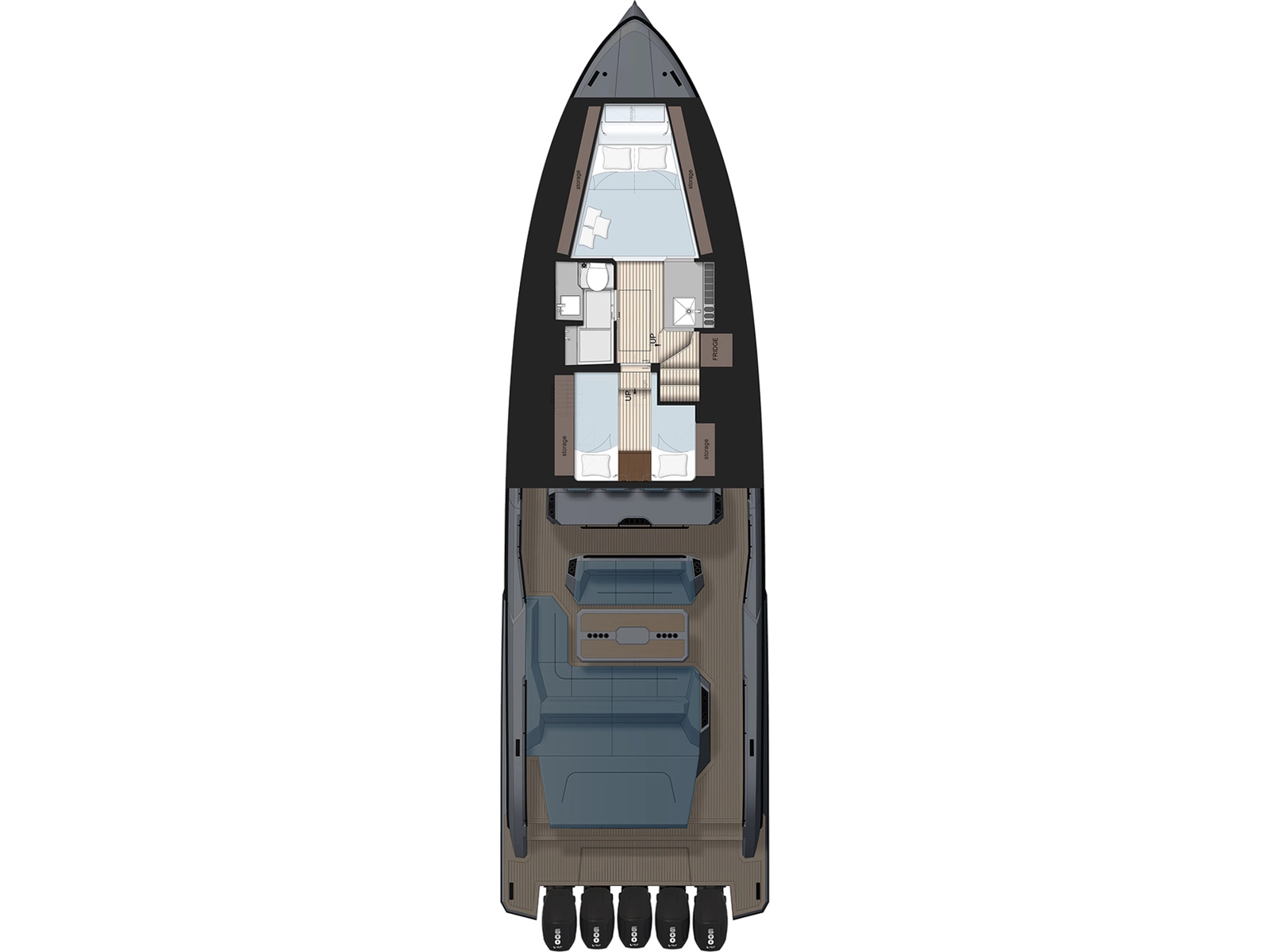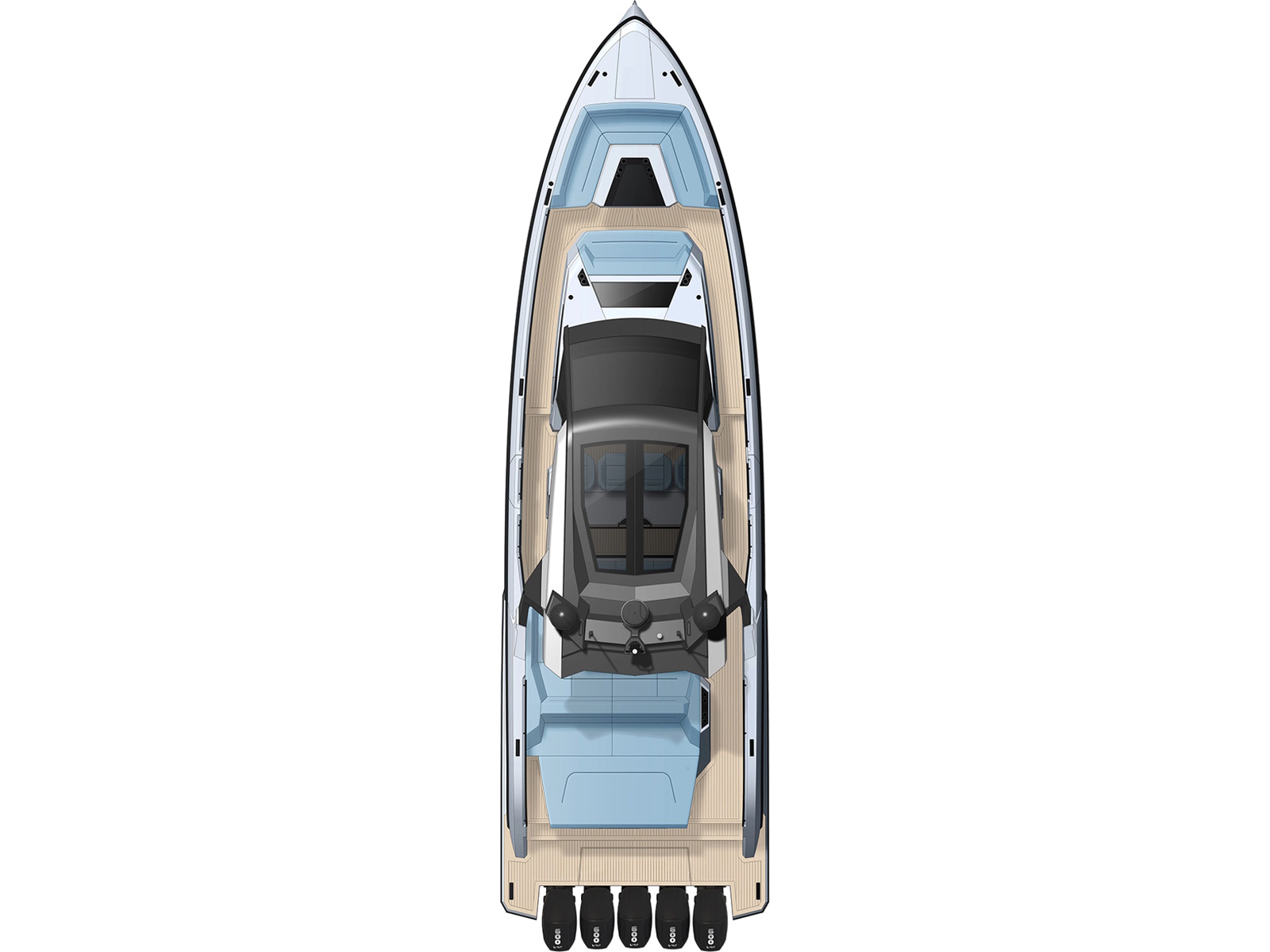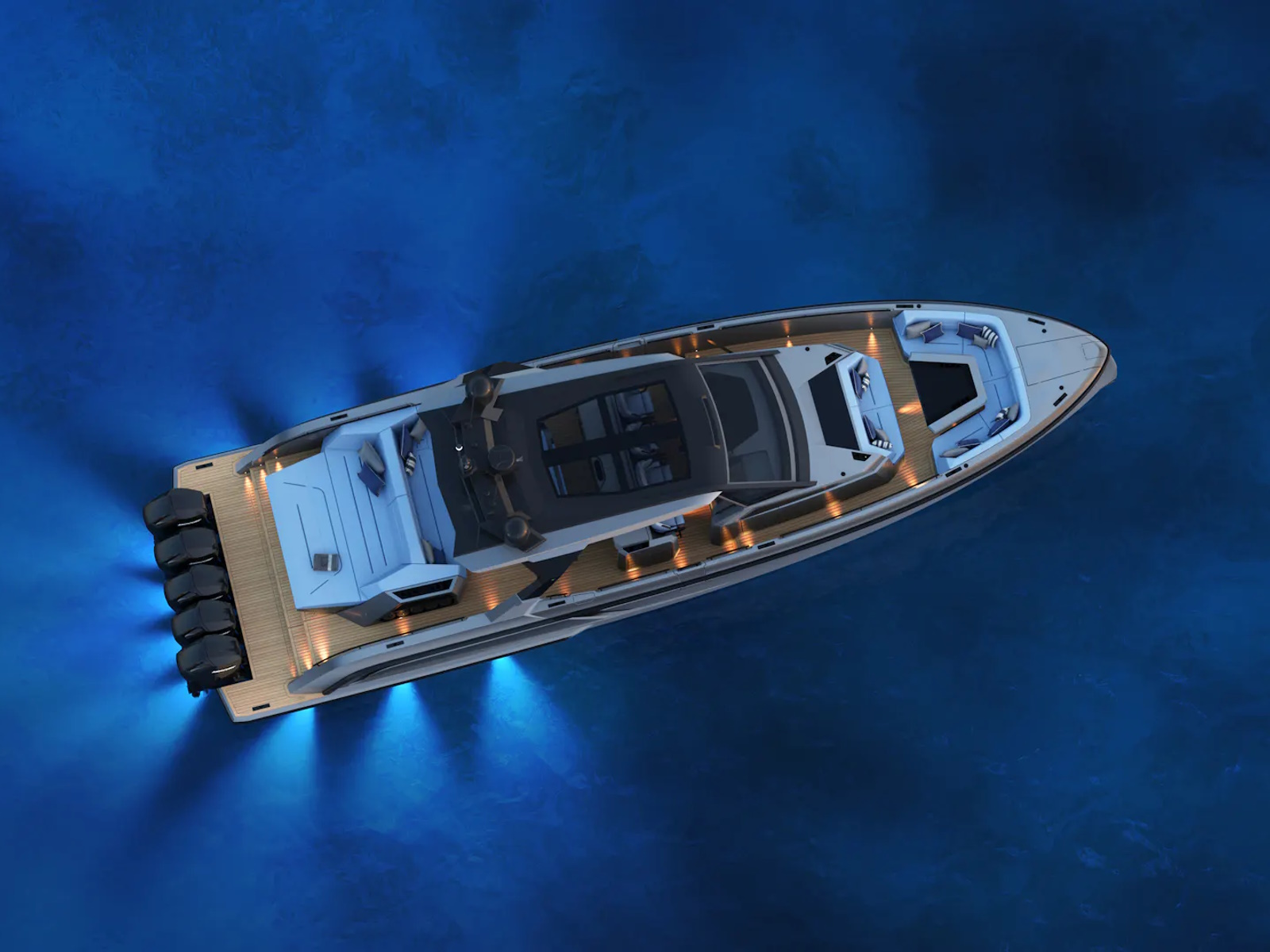 - Designer Guido de Groot and our engineers went to work on stretching the VQ40 to a VQ55, devising a sensational centre-console boat. Twin 1200 horsepower diesels with waterjets will have you riding the waves at 50+ knots and you’ll also be able to head into very shallow waters and beach up on the sand. Moreover, waterjets are also known to be the safest propulsion system for swimmers. In addition, the Vanquish developers are creating a stepped hull outboard version which we are developing mainly for the US and Middle East markets. This will open up the potential for a Veloce model and with four or five Mercury V12 600hp outboard engines your speed will be over 70 knots! There’s no other lifestyle sports yacht of this size that is capable of outperforming the VQ55’s speed.