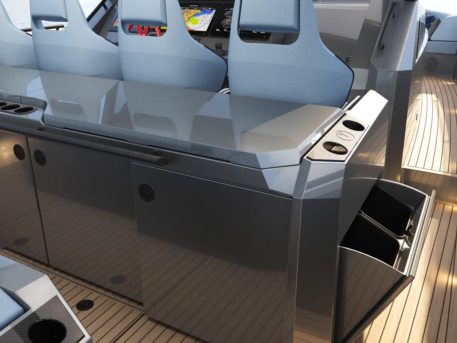 - Each VQ55 Sports Line owner will enjoy the enhanced interior space, high level of comfort as well as long-distance travel capabilities. With two spacious cabins below decks, four people can zoom off the weekend or longer, with a smart on-deck galley complete with fridge, sink, and wine cooler. The finish of the interior as well as the exterior is exceptional.