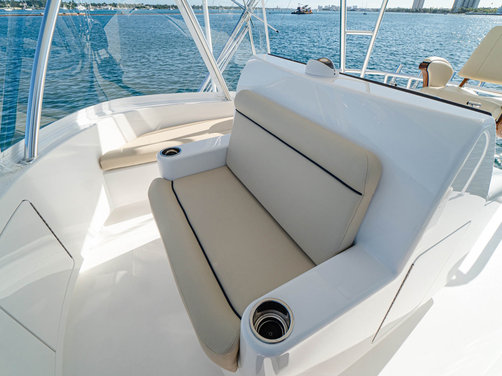 The 46 Billfish’s command deck can be completely enclosed and is climate-controlled. “It’s perfect for anglers who want to get off their feet and cool down as the boat moves from one spot to the next,” says Viking Design Manager David Wilson. The command deck features a salon-like living area with a roomy U-shaped lounge and hi-lo table and a lounge that extends along the starboard side. Both seating areas hold rod storage underneath.