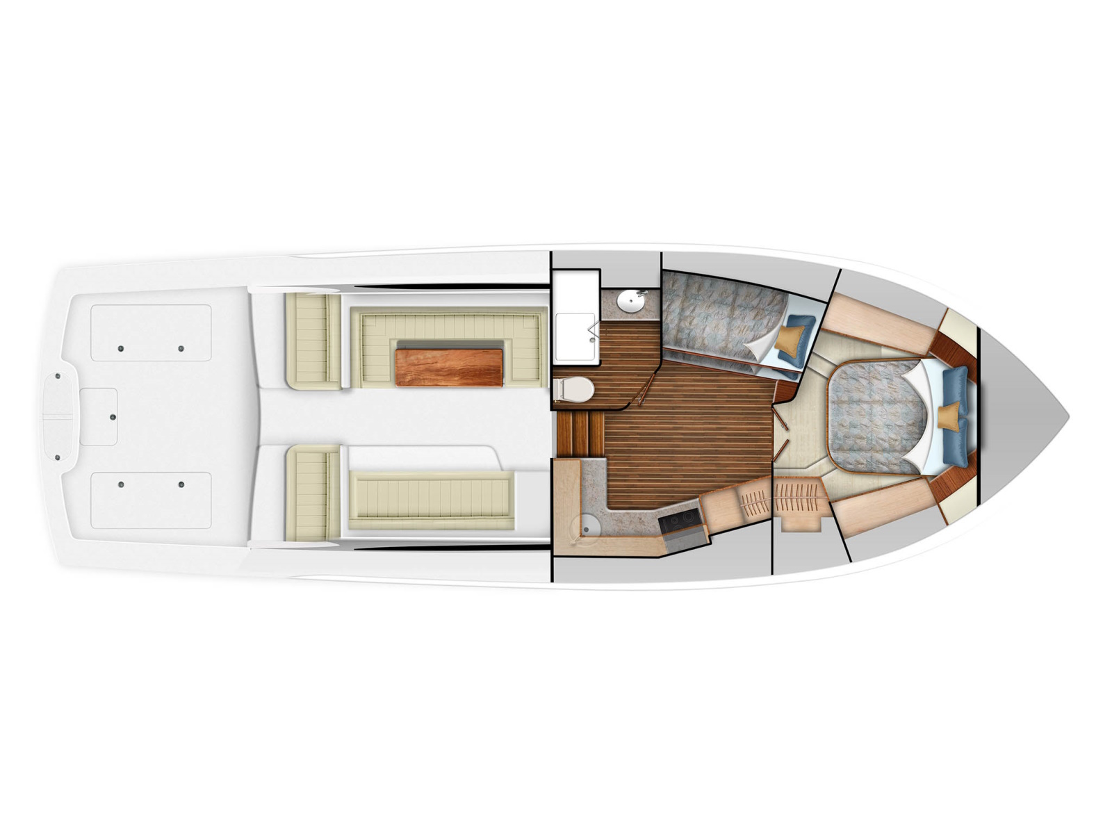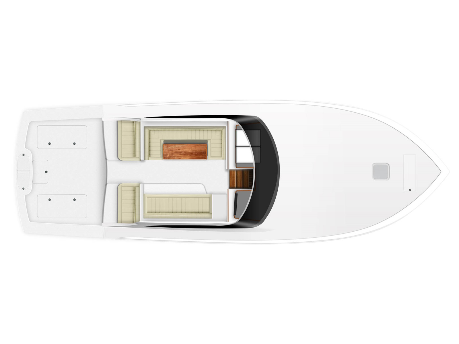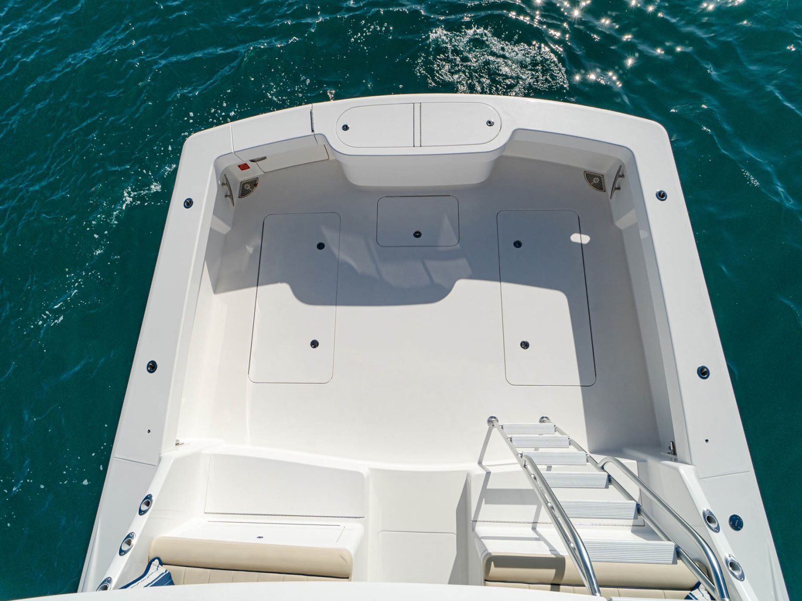 The 140-square-foot cockpit has room for the entire crew or family. The cockpit sole is built with a laminated in-deck mounting plate for fighting chair, rocket launcher or table installations. Standard equipment and features include a cockpit bait freezer with upper tray, in-deck insulated fish boxes port and starboard with overboard drainage, a walk-through transom door and lift gate, a transom fish box and live well, rod holders, tackle storage and fresh and sea-water wash downs. Two-person, mezzanine-style seats flank the centerline walkthrough, and there’s refrigerated drink storage in the starboard mezzanine step, as well as ample general stowage throughout.