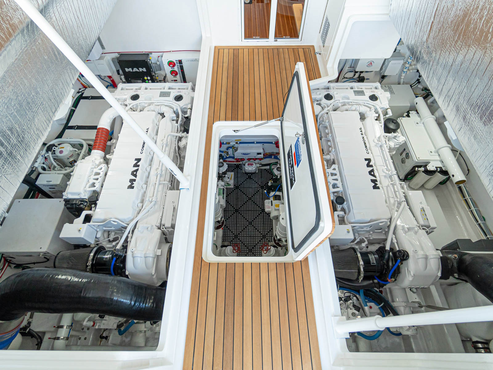 The engineroom, lazarette and forward bilges are painted with Snow White Awlgrip for increased visibility and ease of maintenance. A large centerline hatch gives you quick access to the engines and optional Seakeeper SK 6 gyro. Twin Cummins QSM11 715MHP diesels provide the standard power for the 46 Billfish, with three options: twin MAN 800MHP or 850MHP engines or Scania 900MHP engines.