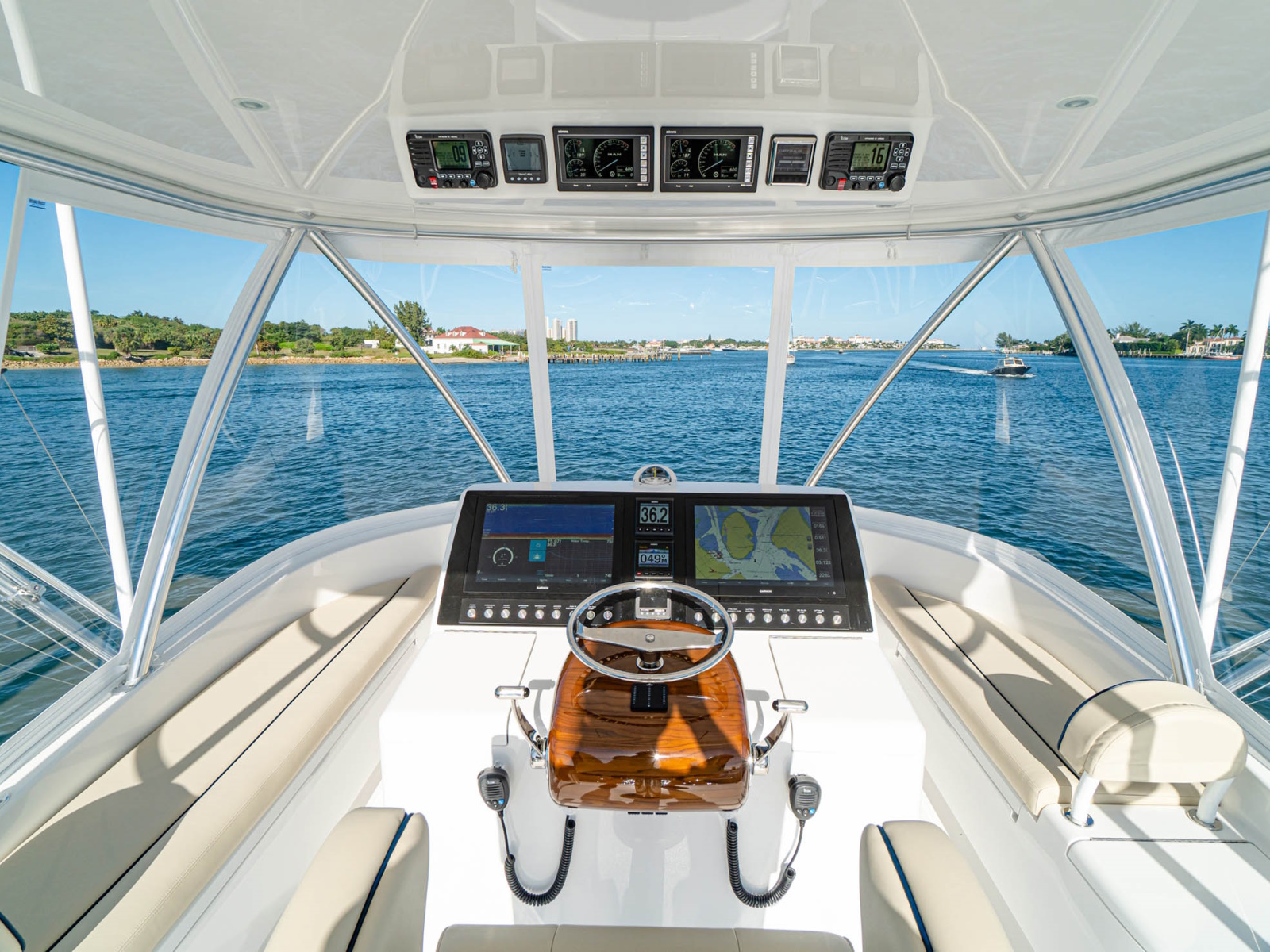 Like our legendary Viking convertibles, the 46 Billfish’s flybridge is designed with a tournament-style center console walk-around helm. The 46 Billfish has Palm Beach-style controls and electric power steering. Seating includes a single Release Marine teak chair (a second helm chair is optional) and lounges to port and starboard and a forward console seat. Our subsidiary Atlantic Marine Electronics can build and install a complete package of navigation and communication equipment to deliver the boat turnkey ready.