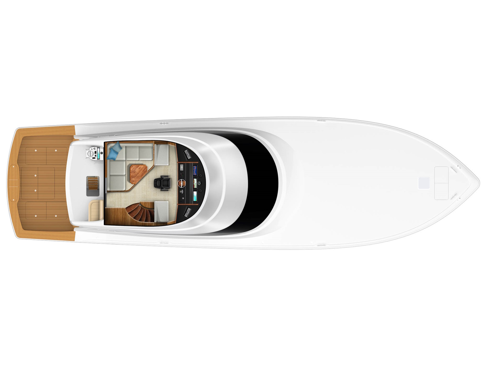 The stand-up engineroom features Viking’s structural stringer system with aluminum saddles and methacrylate bonding. Fuel tanks are molded into the hull for strength and optimal draw, with a standard capacity of 2,015 gallons and an optional upgrade to 2,377 gallons.