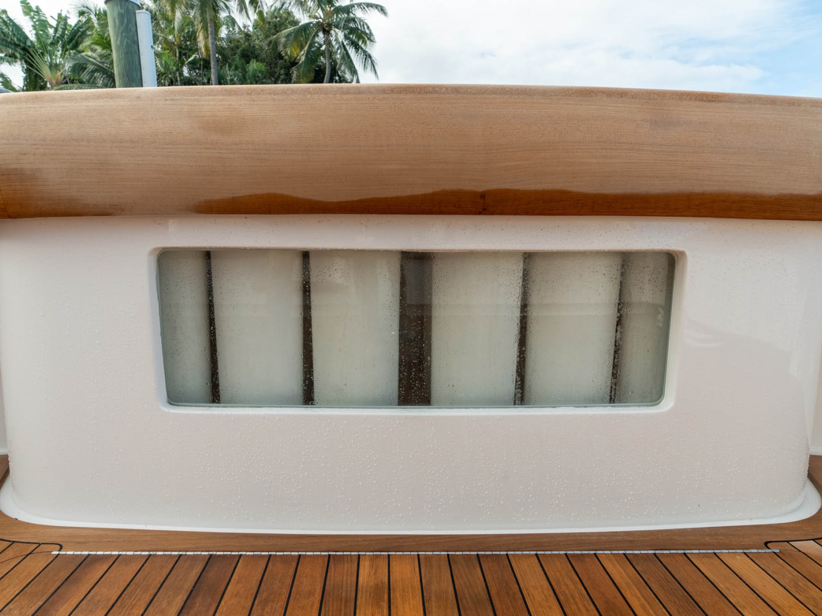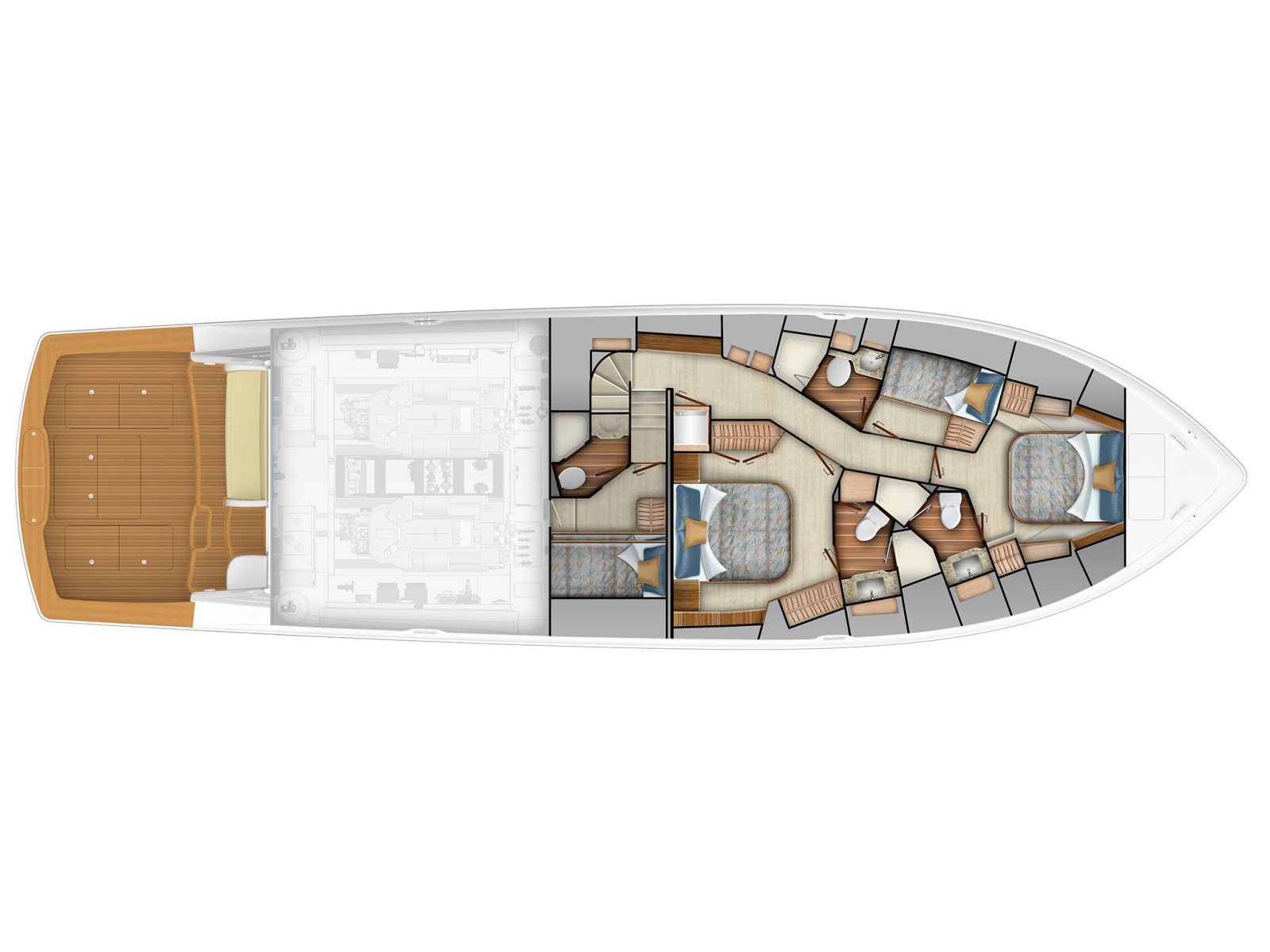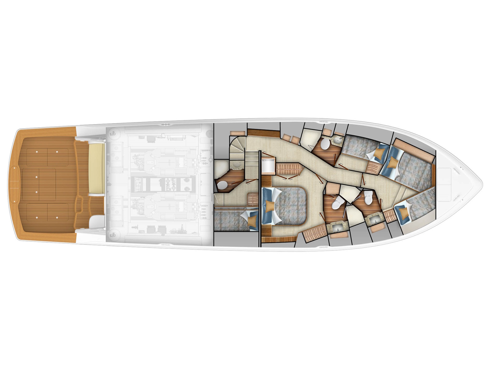 The master stateroom includes a queen walkaround berth, ensuite head, HDTV and ample storage. The forward VIP features another queen berth with deep under-bed space, while the port and crew staterooms each provide over-under bunks and private heads with showers. Crew quarters have their own staircase for added privacy.