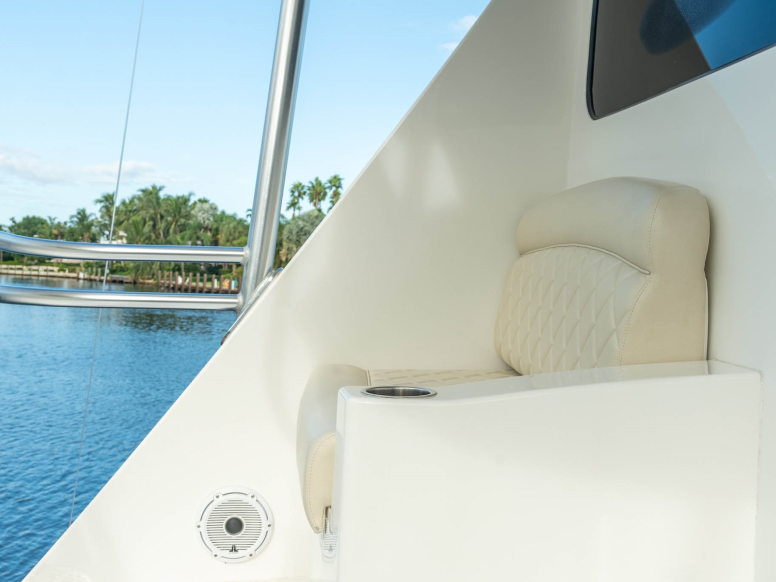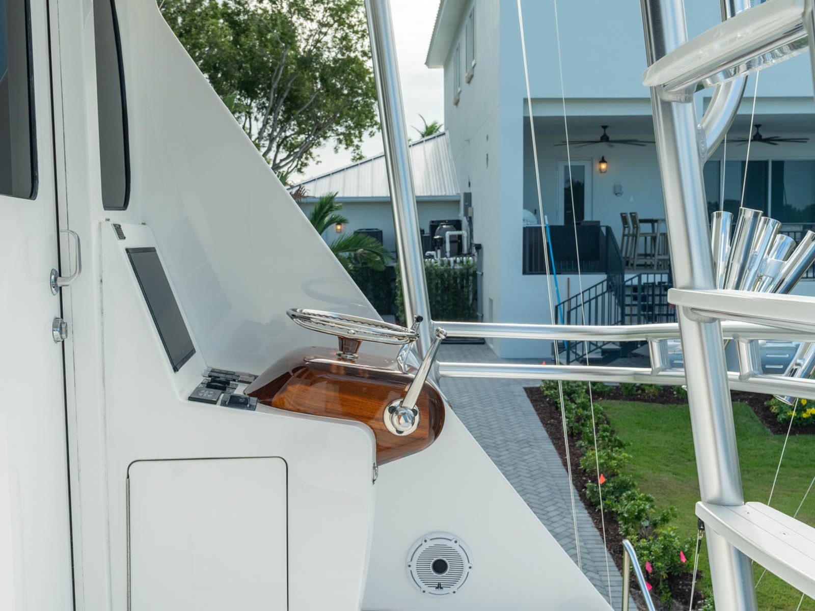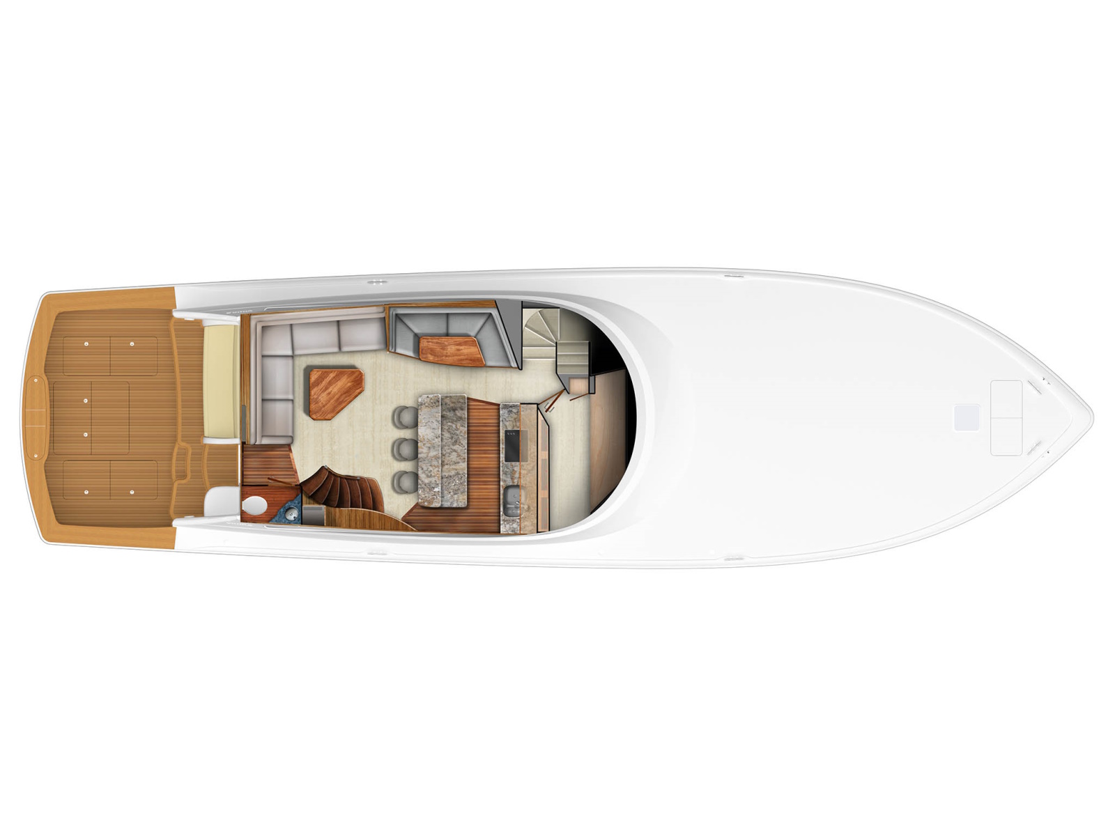 A 176-square-foot cockpit anchors the action, offering a complete suite of tournament features along with an observation mezzanine and Seakeeper for added stability. Features include a walk-through transom door with lift gate, transom live well, in-deck fishboxes, chilled salon step box, washdowns and a reinforced backing plate for a fighting chair. The mezzanine is equipped with aft-facing seating, tackle drawers, a bait freezer and access to the lazarette and Seakeeper. Dual Glendinning Cablemasters ease shore power handling.