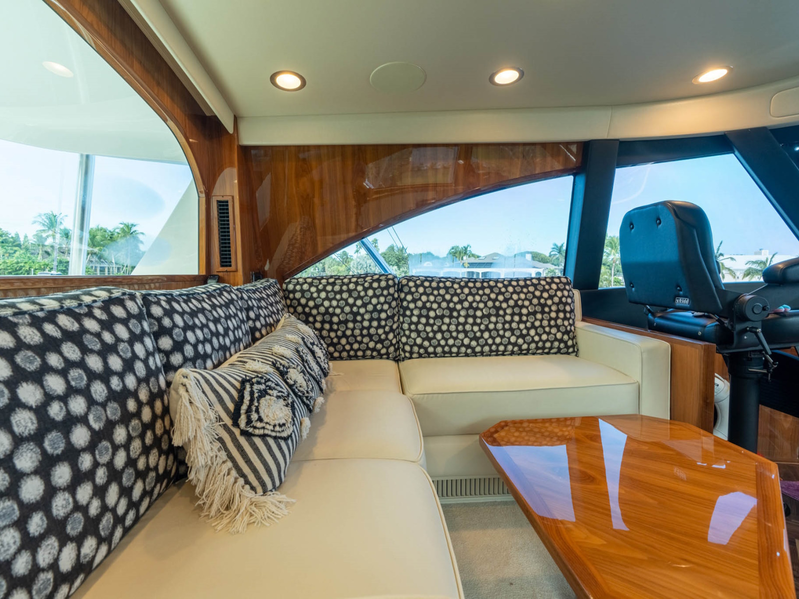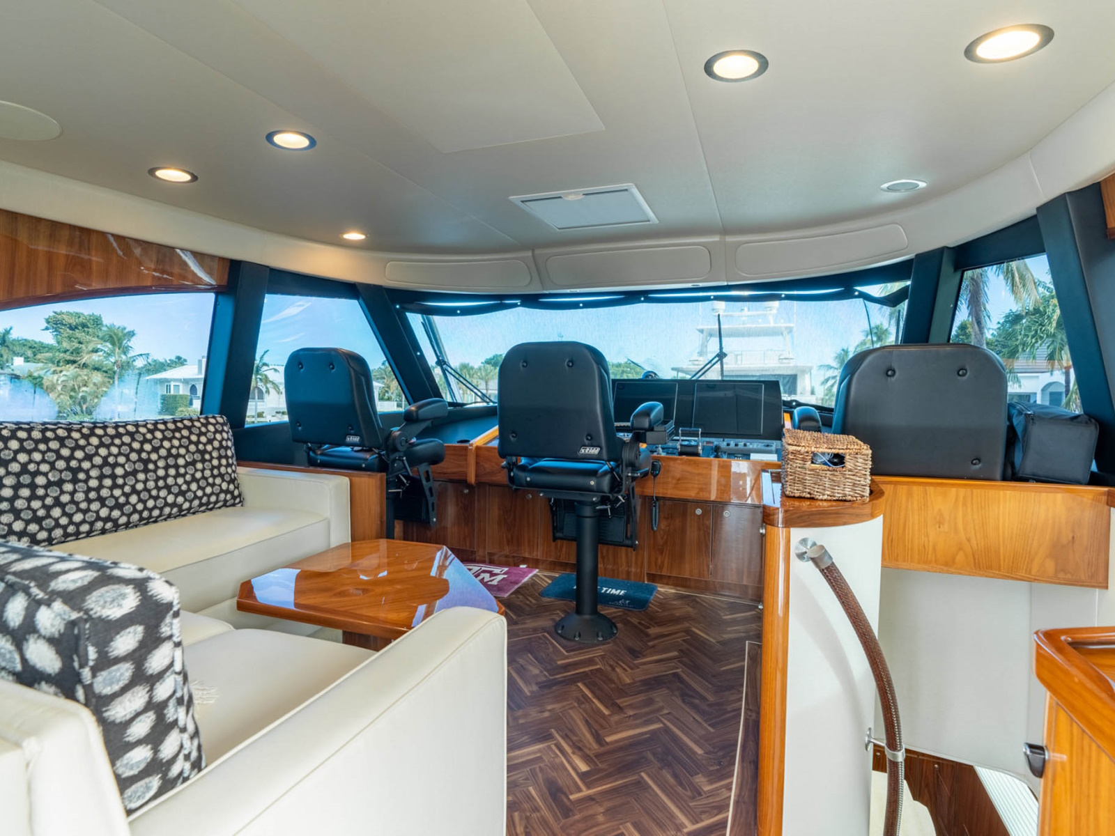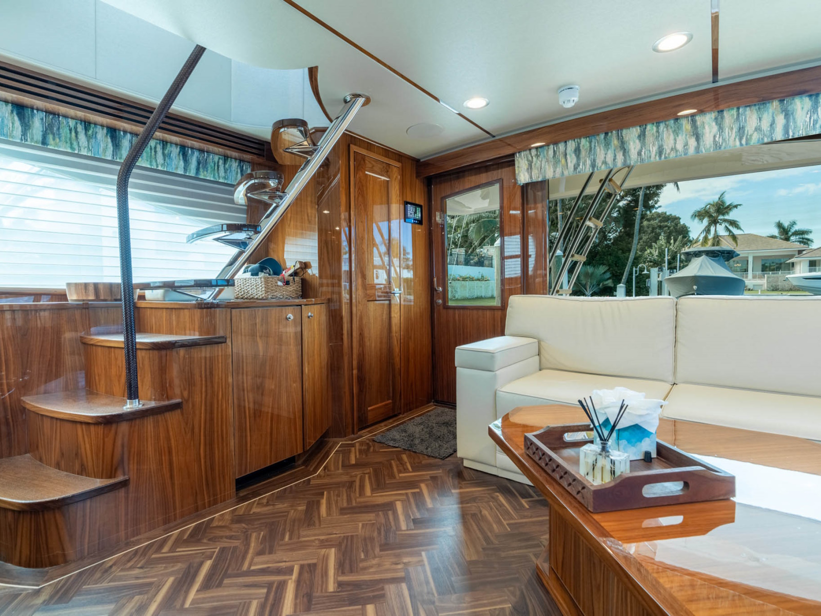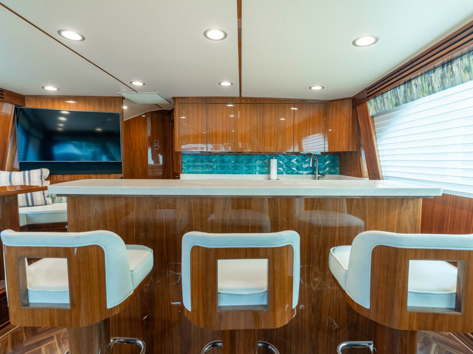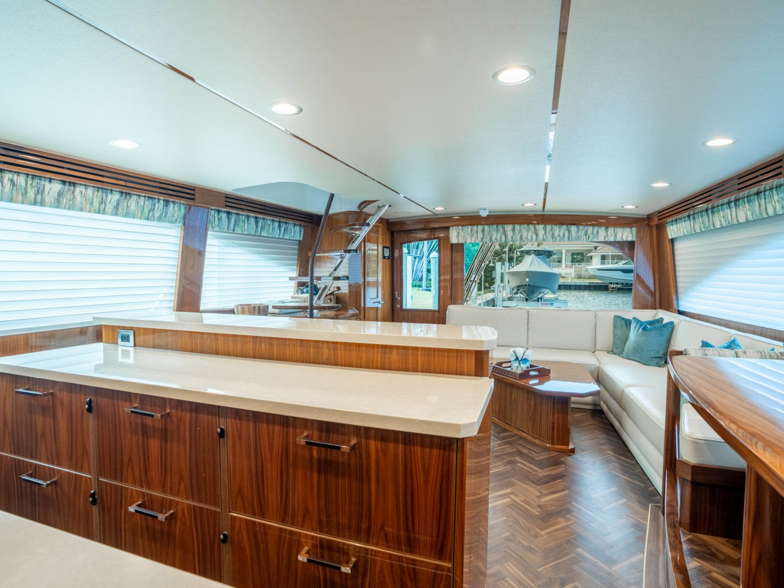 The lower salon features an L-shaped lounge with cockpit views, an island galley with bar stools and a raised dinette with a walnut table. Premium materials, satin or gloss-finished walnut cabinetry and thoughtful detailing create a warm, refined atmosphere. The interior staircase to the bridge blends function with style.