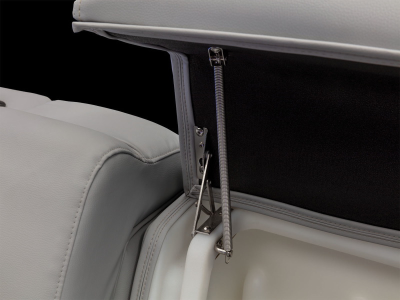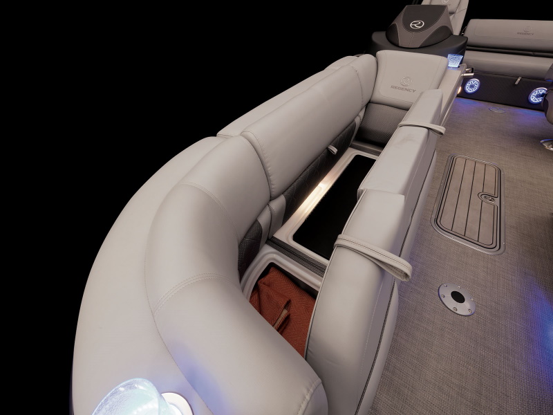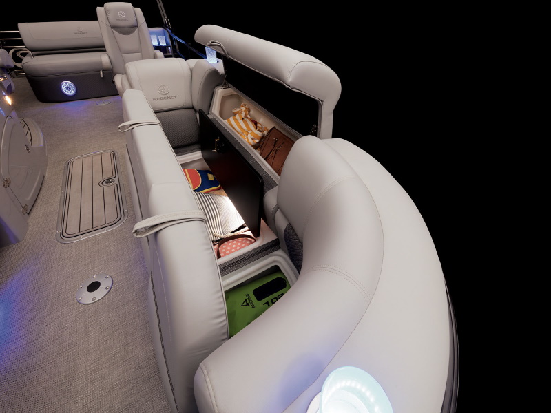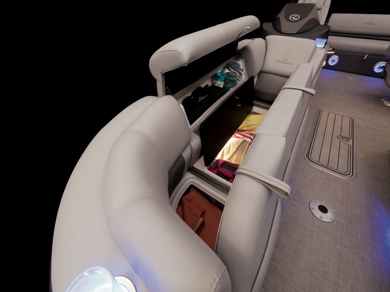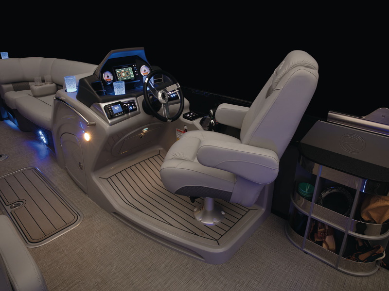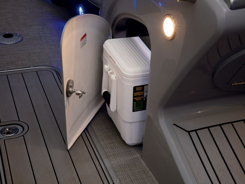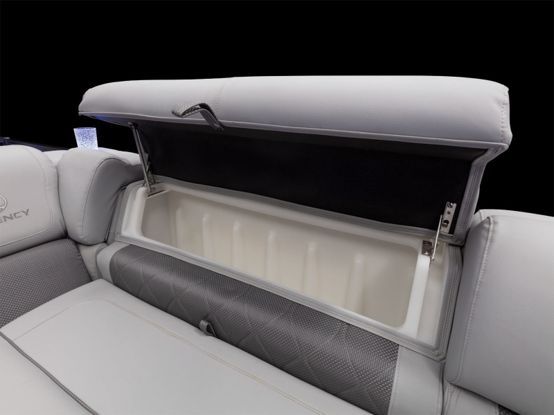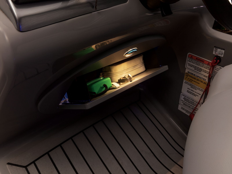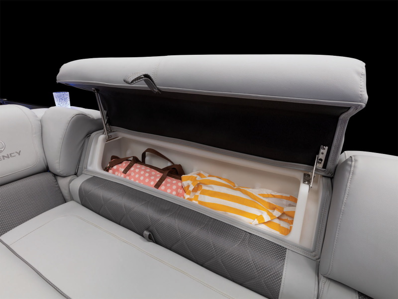 - Wraparound bow starboard lounge w/STOW MORE™, deep cushions, pillowtop backs, lumbar support, lighted lockable storage, 12V outlet & lighted drink holder