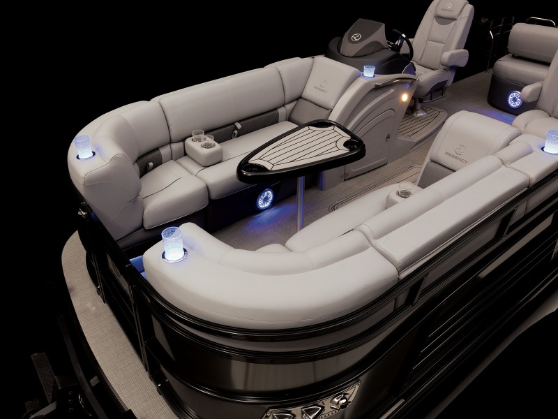 - Wraparound bow port lounge w/STOW MORE™, deep cushions, pillowtop backs, lumbar support, lighted lockable storage, 12V outlet & lighted drink holders