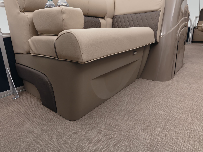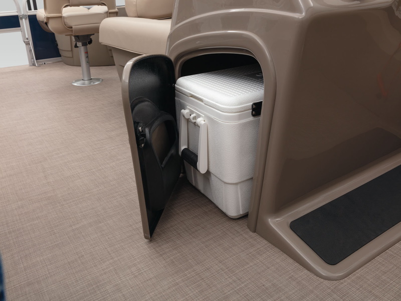 With a 22’ 1” by 8’ 6” deck, this boat has plenty of room in the playpen for two loaded fishing decks, both with an aerated livewell, two fishing chairs and rod storage (lockable rod storage is conveniently located near the aft fishing deck). But the fun doesn’t stop there! There’s also midship lounge seating port and starboard, both with the STOW MORE™ seat storage system, a 11’ Bimini top, Bazooka® stereo system and more!