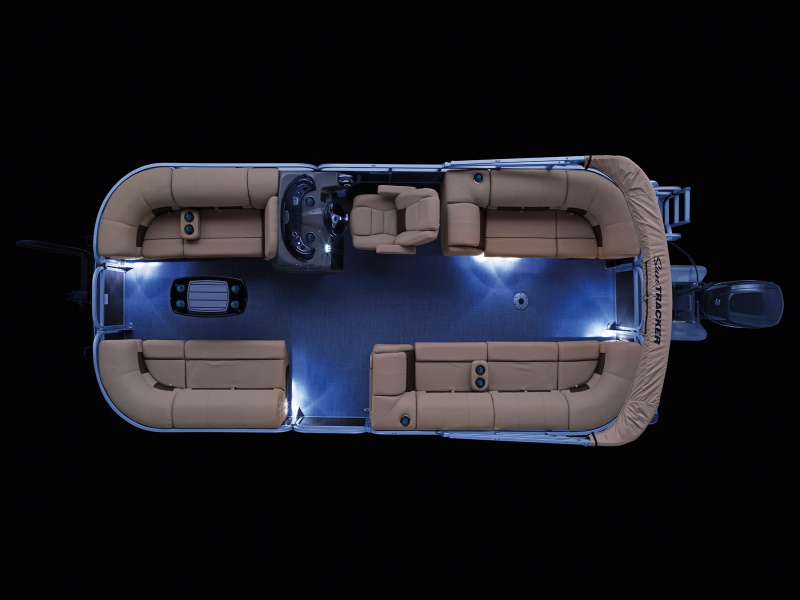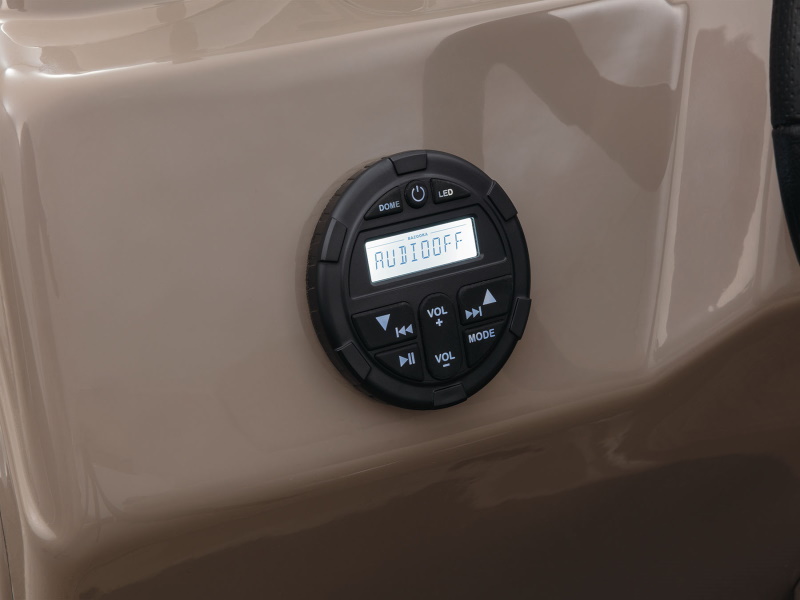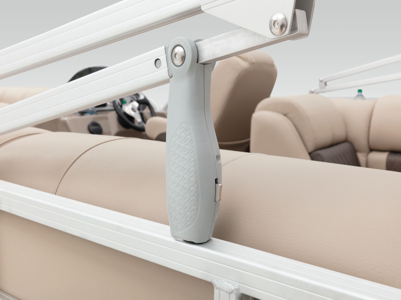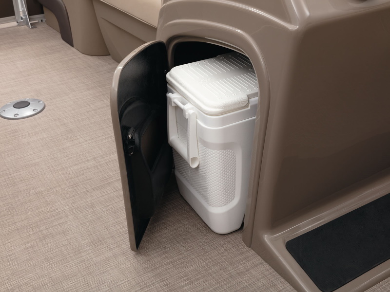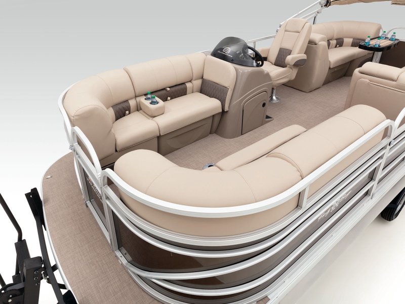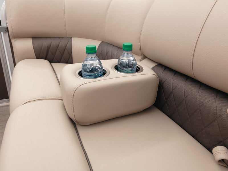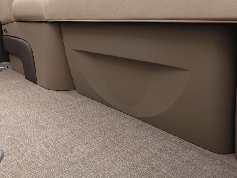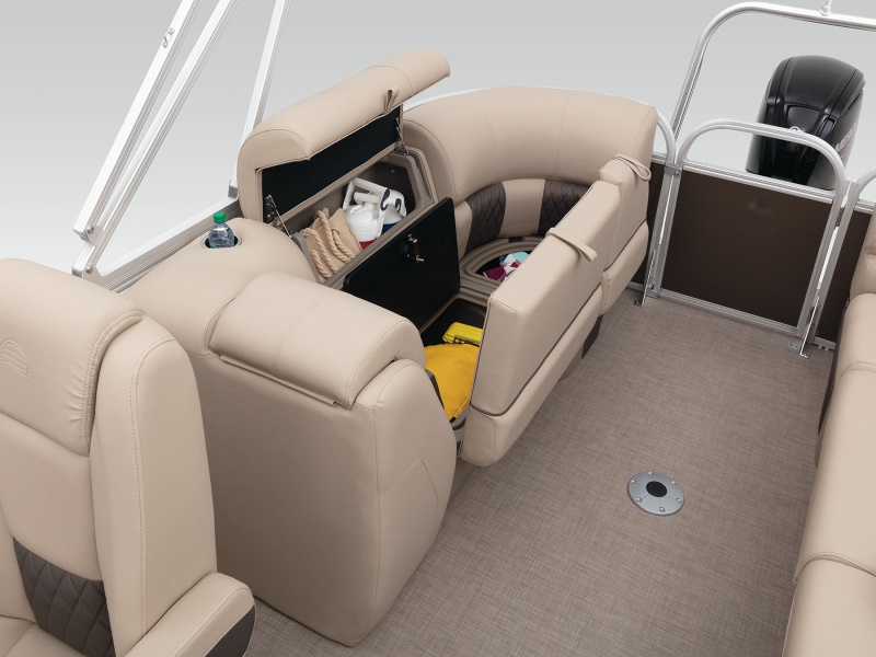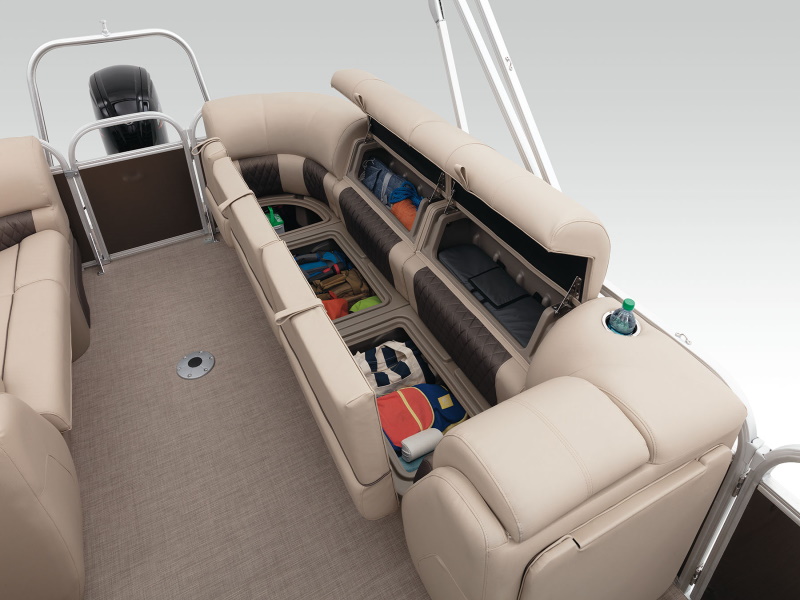 Onboard, you’ll find four extremely spacious lounges, each loaded with our STOW MORE™ seat storage system. This system includes rotomolded underseat storage AND seat-back compartments that can be accessed without even standing up! It builds on that comfort with an 11’ QUICKLIFT® Bimini top, Bazooka® sound system and more!
