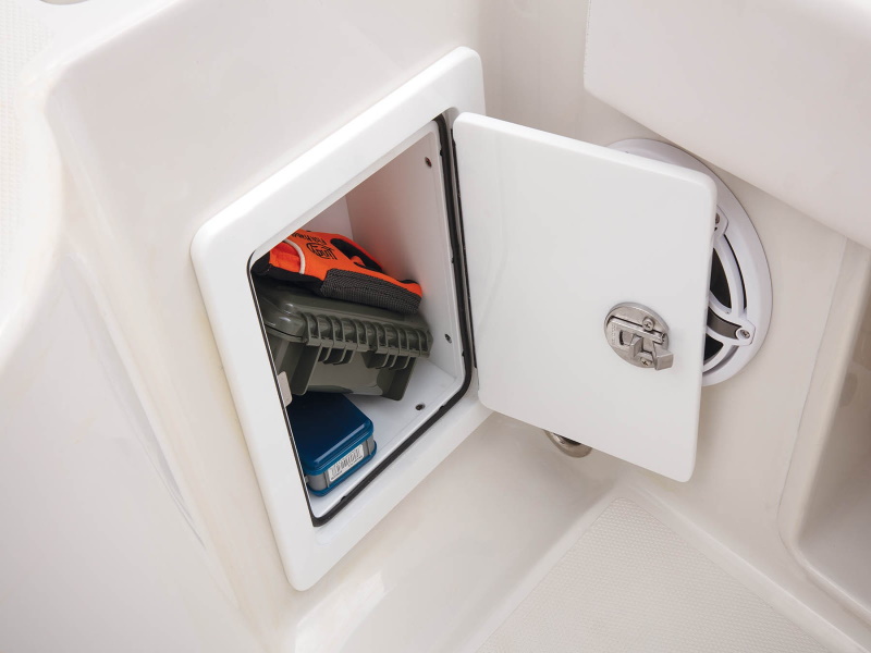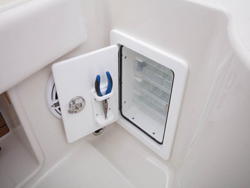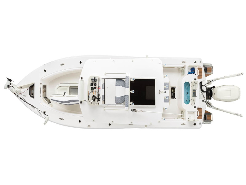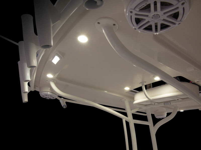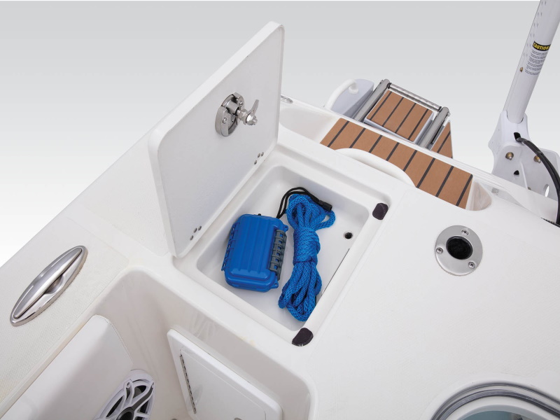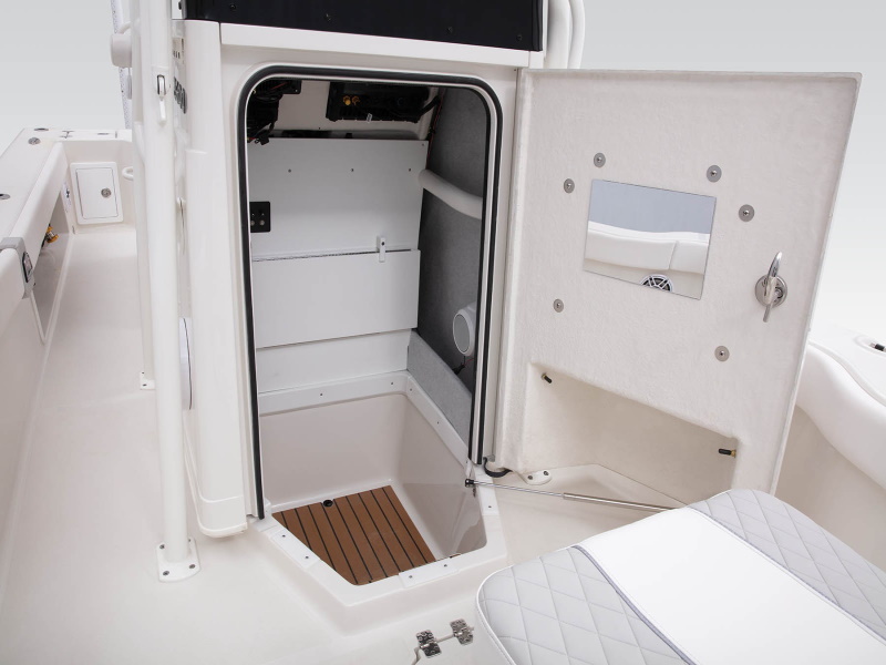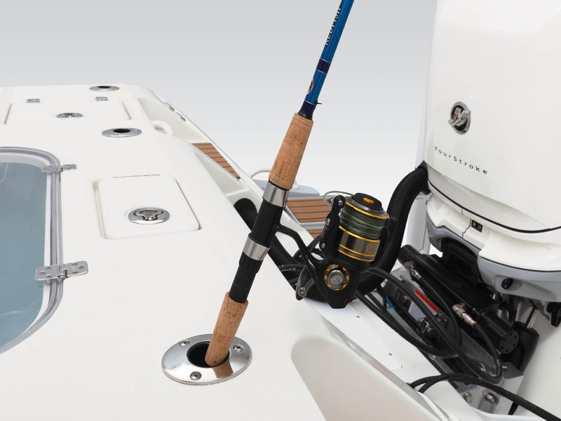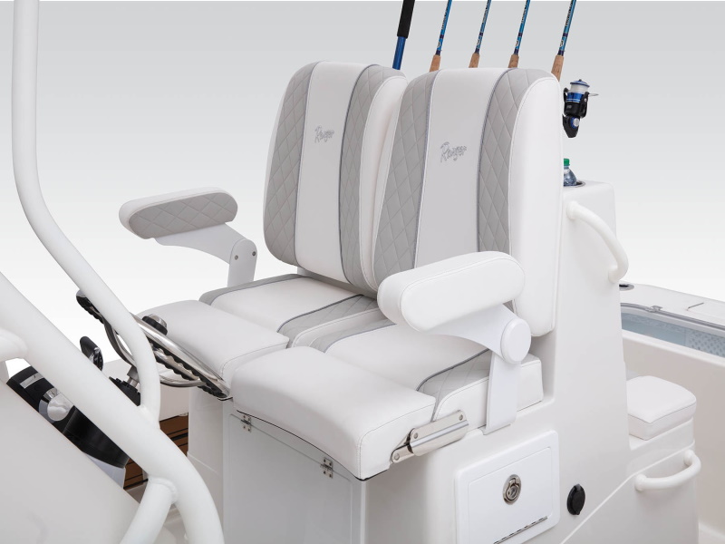 - Custom fitted premium marine upholstery - leaning post w/ mezzanine seating, baitwell/cooler and storage