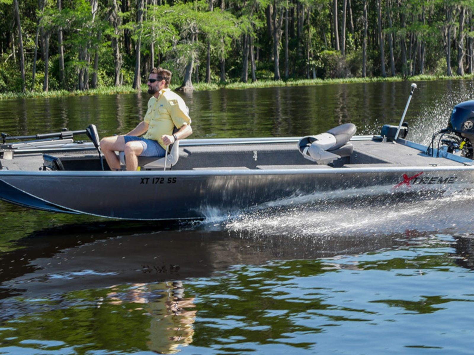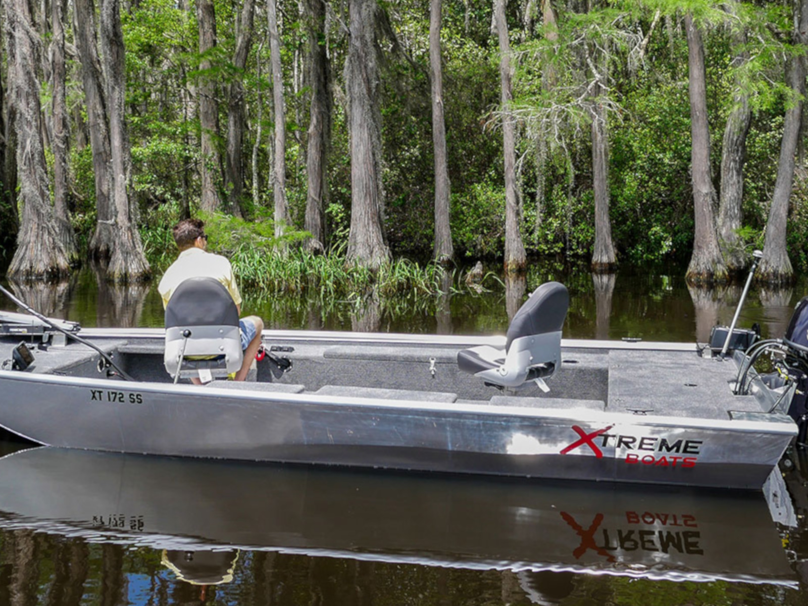The largest of our standard production aluminum bass boats, everything about the XT is giant sized. The XT comes in bottom widths of 60 and 72 inches and lengths of 17, 18 and 20 feet. Our standard layout moves all compartments — rod box, live well, storage — to the sides of the hull, allowing our completely clear “Center Aisle” for ultimate ease of fishing. A Full-V bottom front-to-back allows for the driver to enjoy superb handling and added comfort in choppy lakes or bays. Heavily flared sides ensure a dry ride on a choppy day. The large “footprint” provides exceptional stability with no feeling of wobbling or rocking when walking around. Equipped with a low-resistance hull design, the XT is a fast, lightweight, tough-as-nails, ultra-stable aluminum boat.
