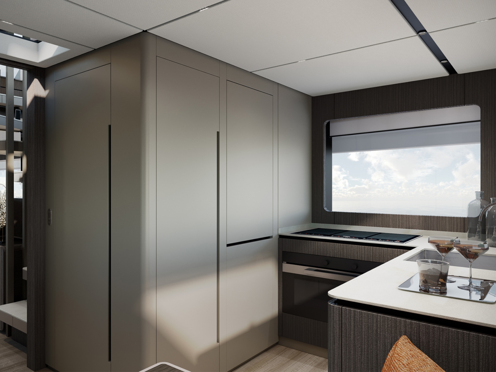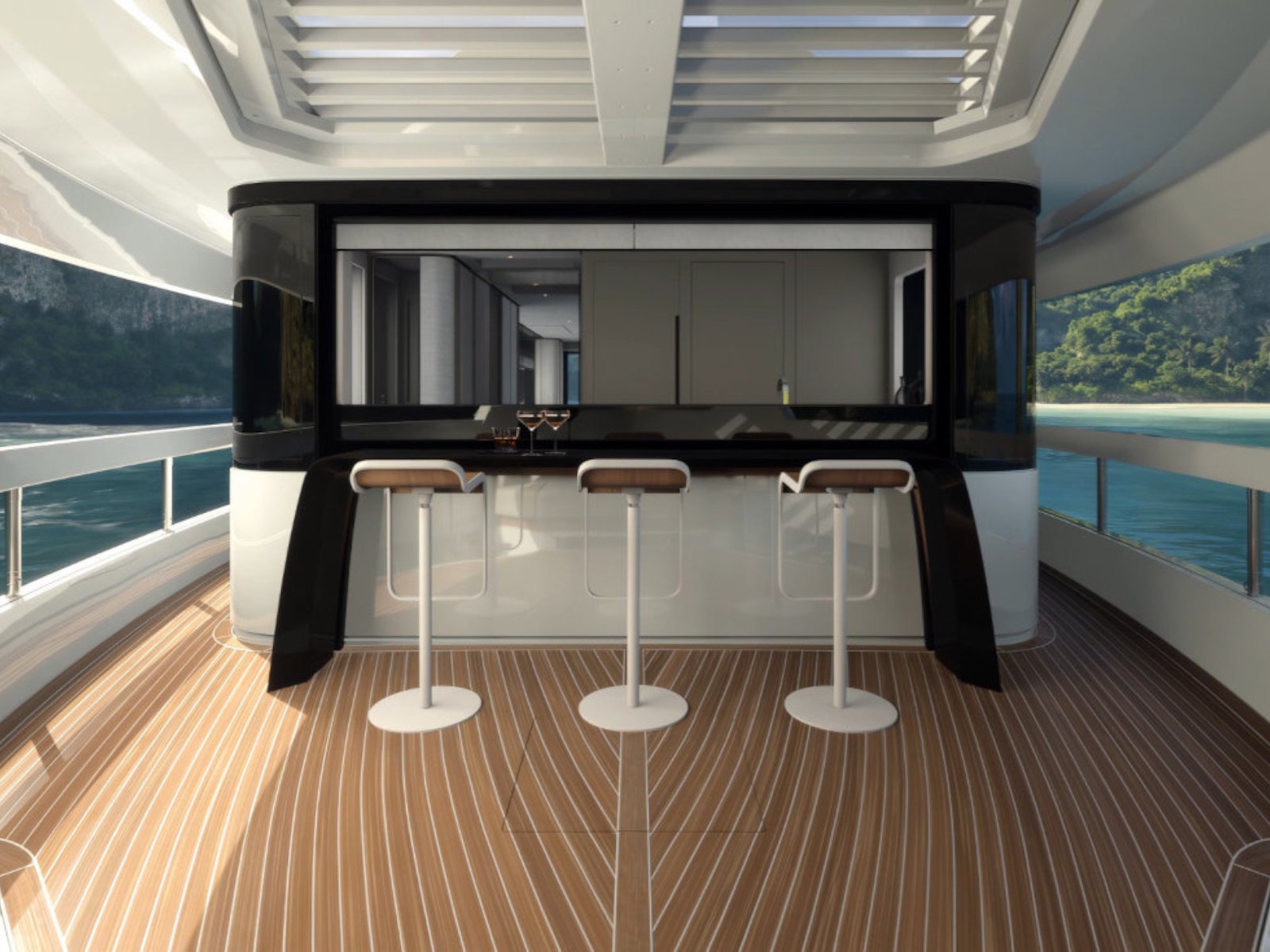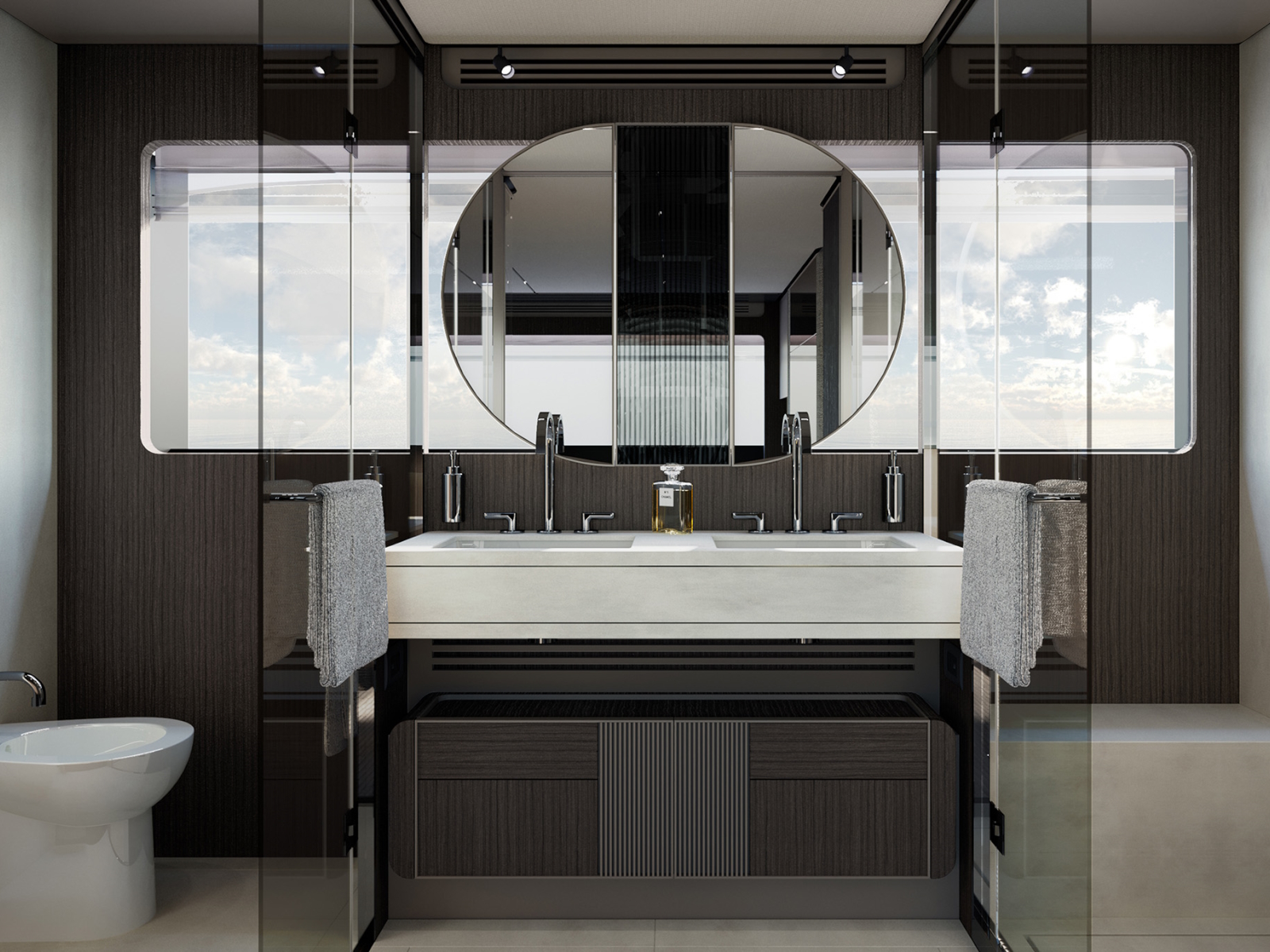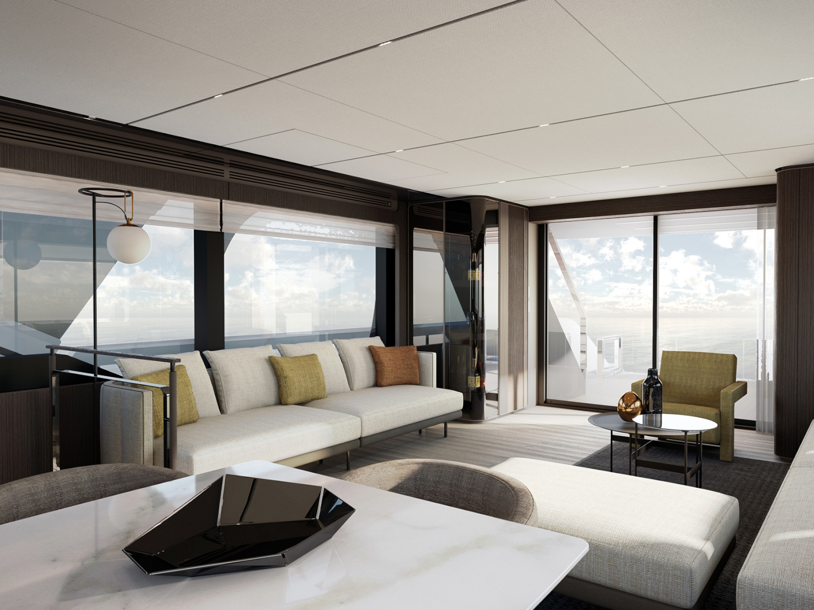 This flybridge yacht, with its streamlined design, sleek lines and sharp styling, satisfies the owner’s every wish in terms of comfort, style, seaworthiness and safety at sea. After the recent major restyling, Ferretti Yachts 780 features extensive glazed surfaces in the hull, giving the sleek and streamlined profile a sportier look, new furnishings, with an enlarged bar in a central position in the standard layout, and redesigned interiors, with the possibility of choosing between two moods: classic or contemporary.