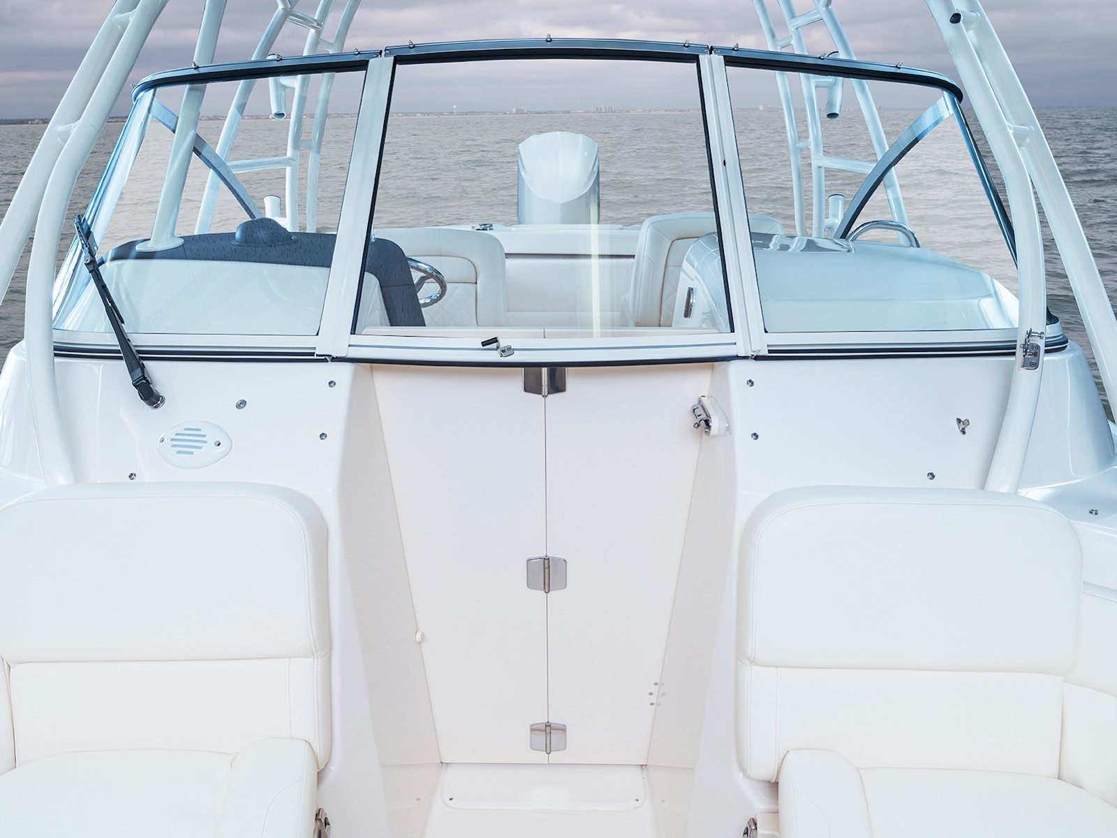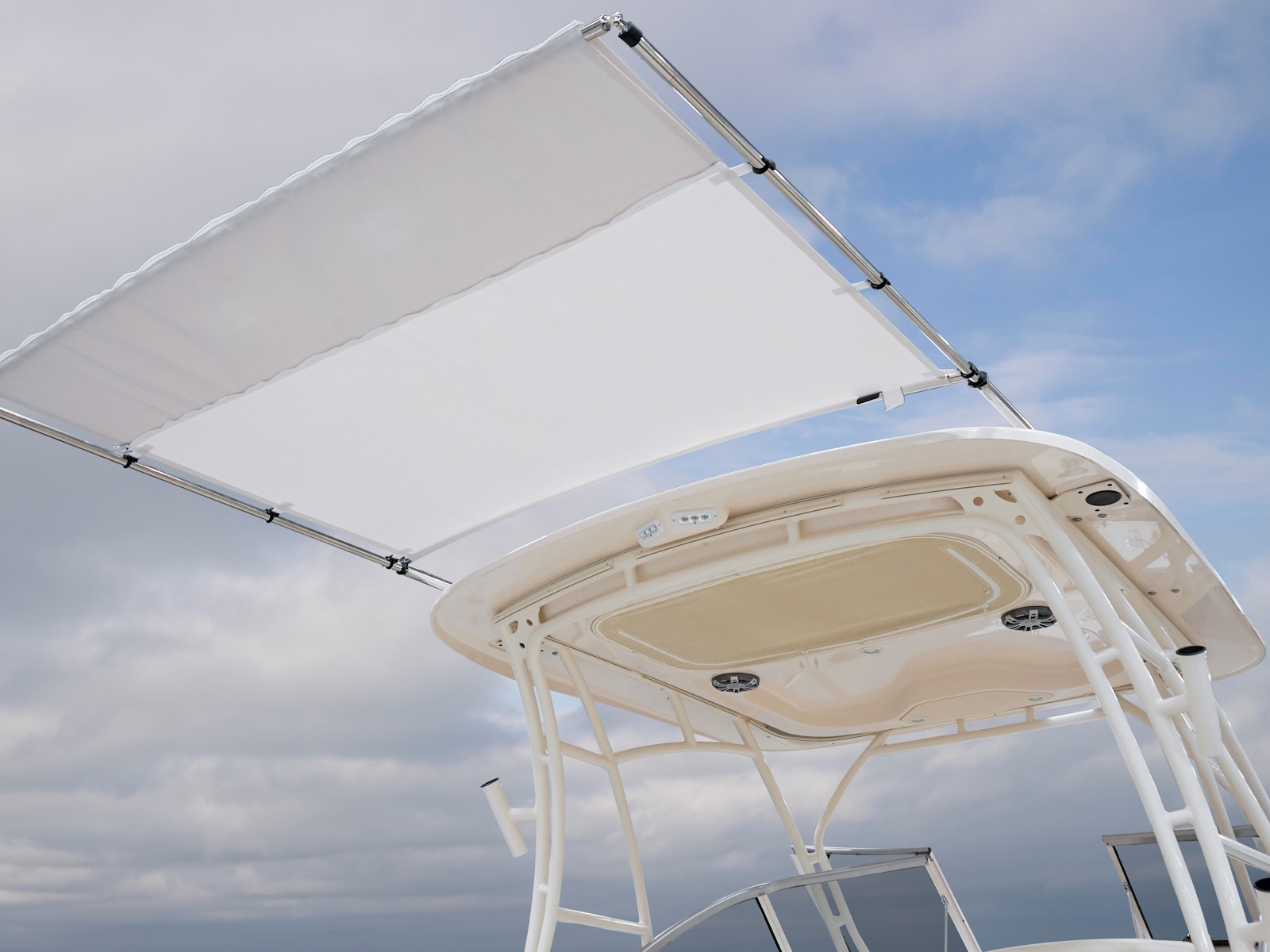 - SureShade® electrically retractable cockpit shade w/Sunbrella® canvas (oyster) (not available w/top mounted rod holders or outrigger kit options)
