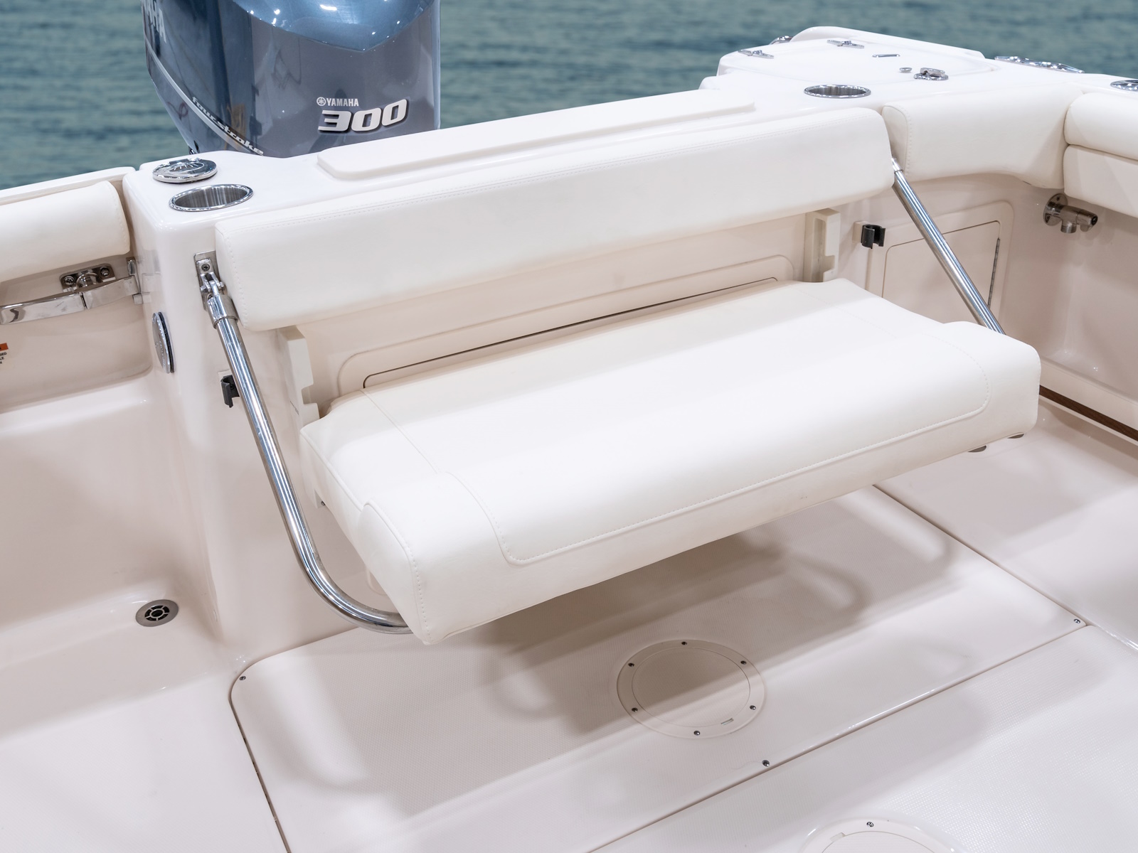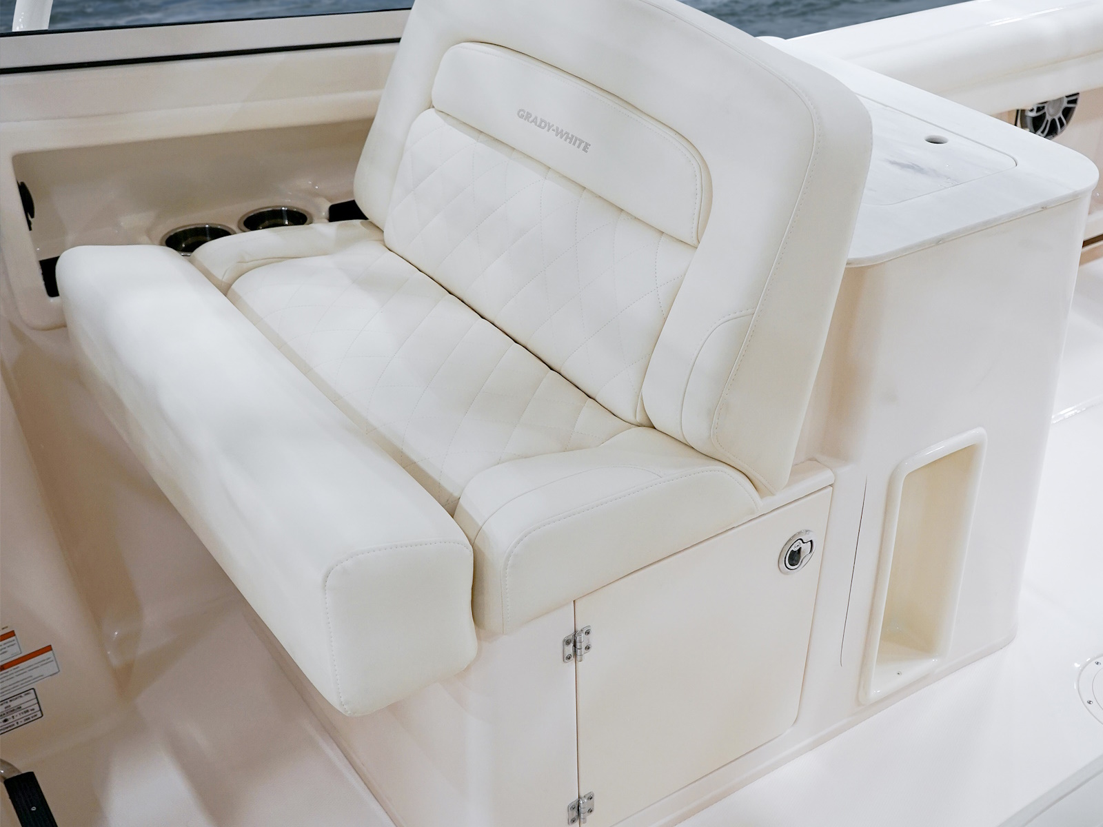 - Seating - electromechanically adjustable helm bench seat w/flip-up bolster & Deluxe wet bar w/Corian® countertop, sink w/removable cover, drink holders (2), storage drawers (3), trash compartment & fire extinguisher holder