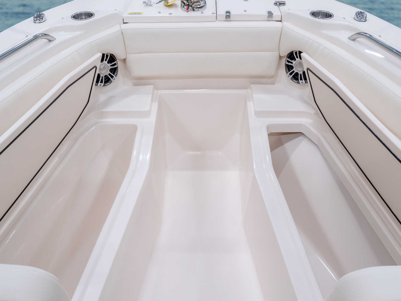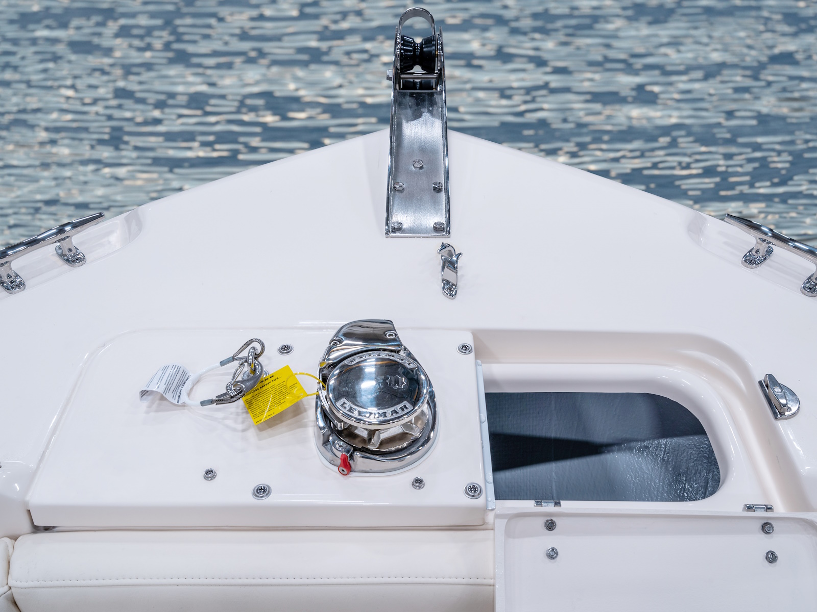 80-qt. (75.7 l) port bow storage box | Forward anchor locker w/rode storage | Lockable starboard console compartment w/light & storage pocket w/tackle trays (2)