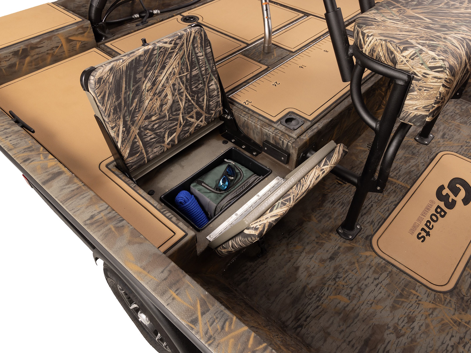 Stern layout provides jump seats on both sides of the stern livewell for those additional passengers along with small item storage. Shown with optional SeaDek®.