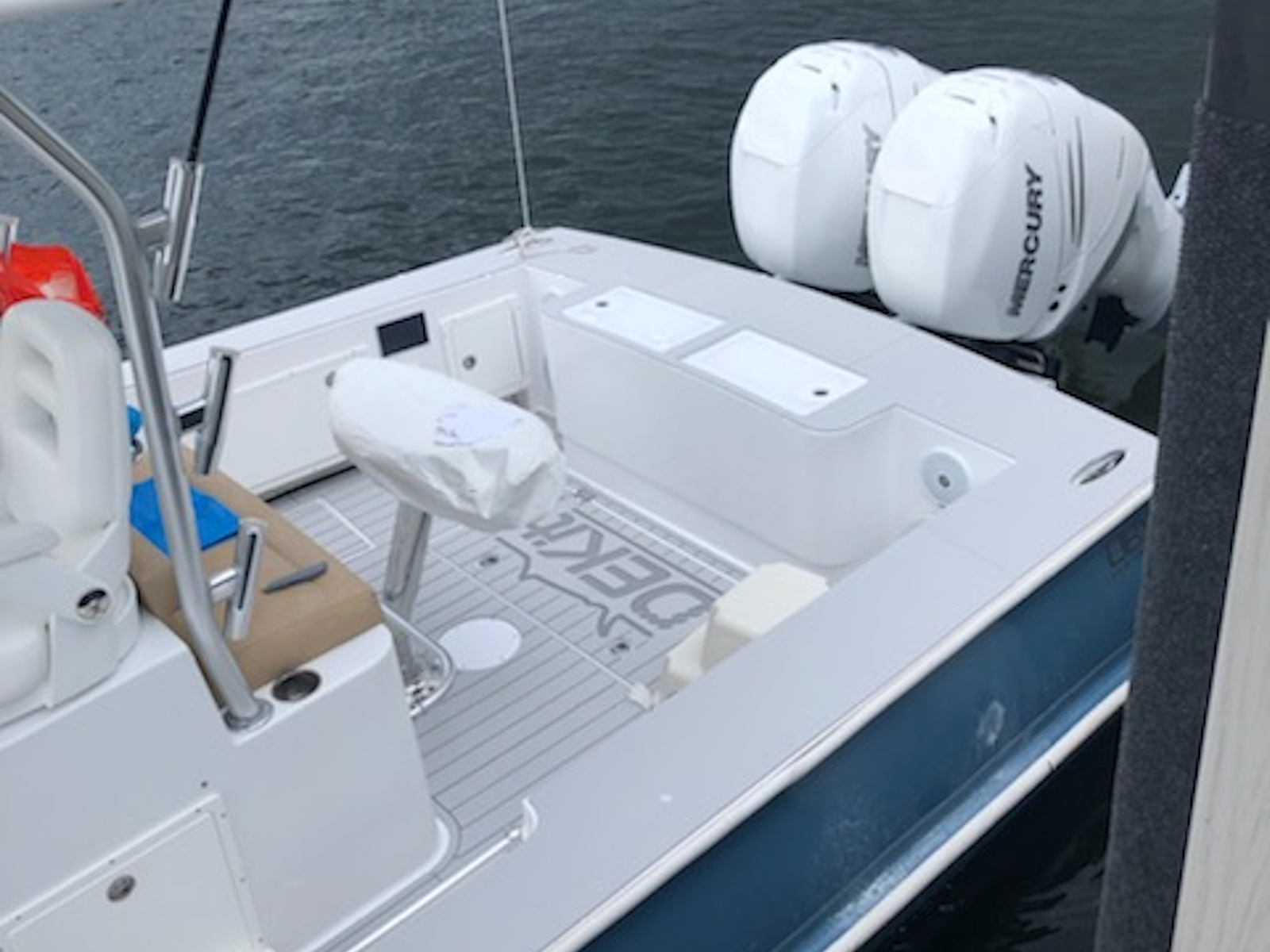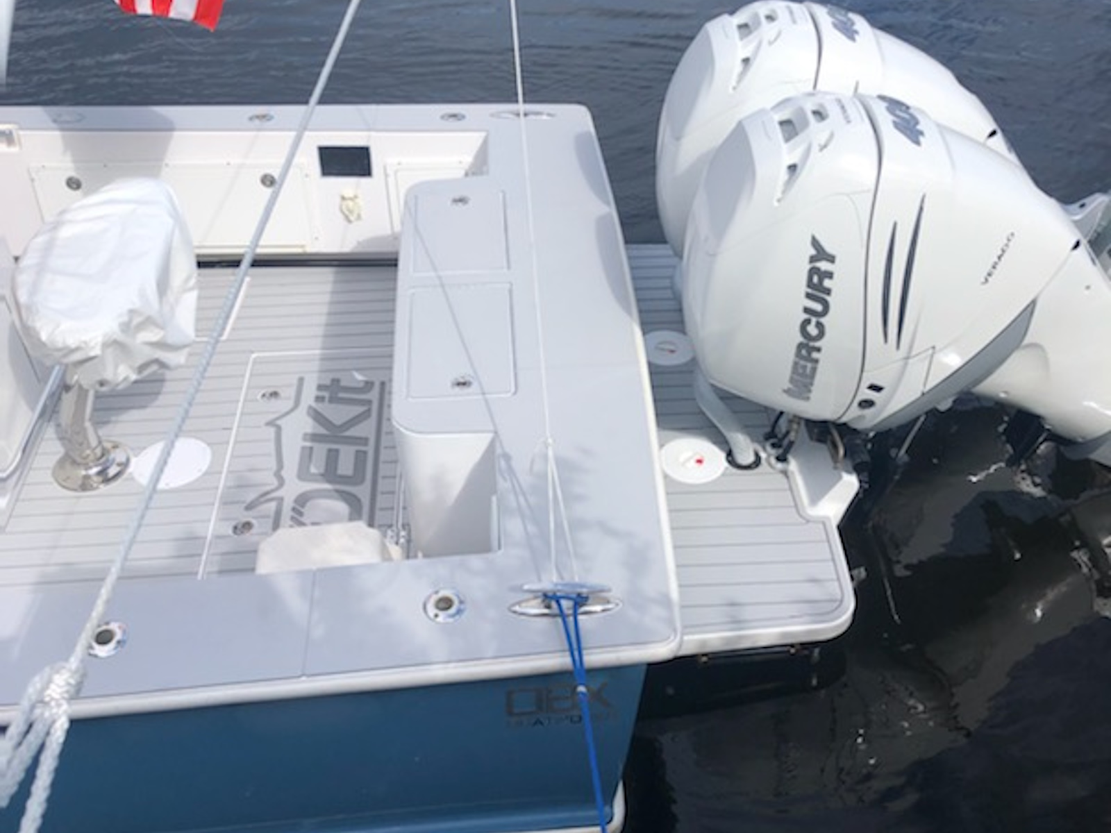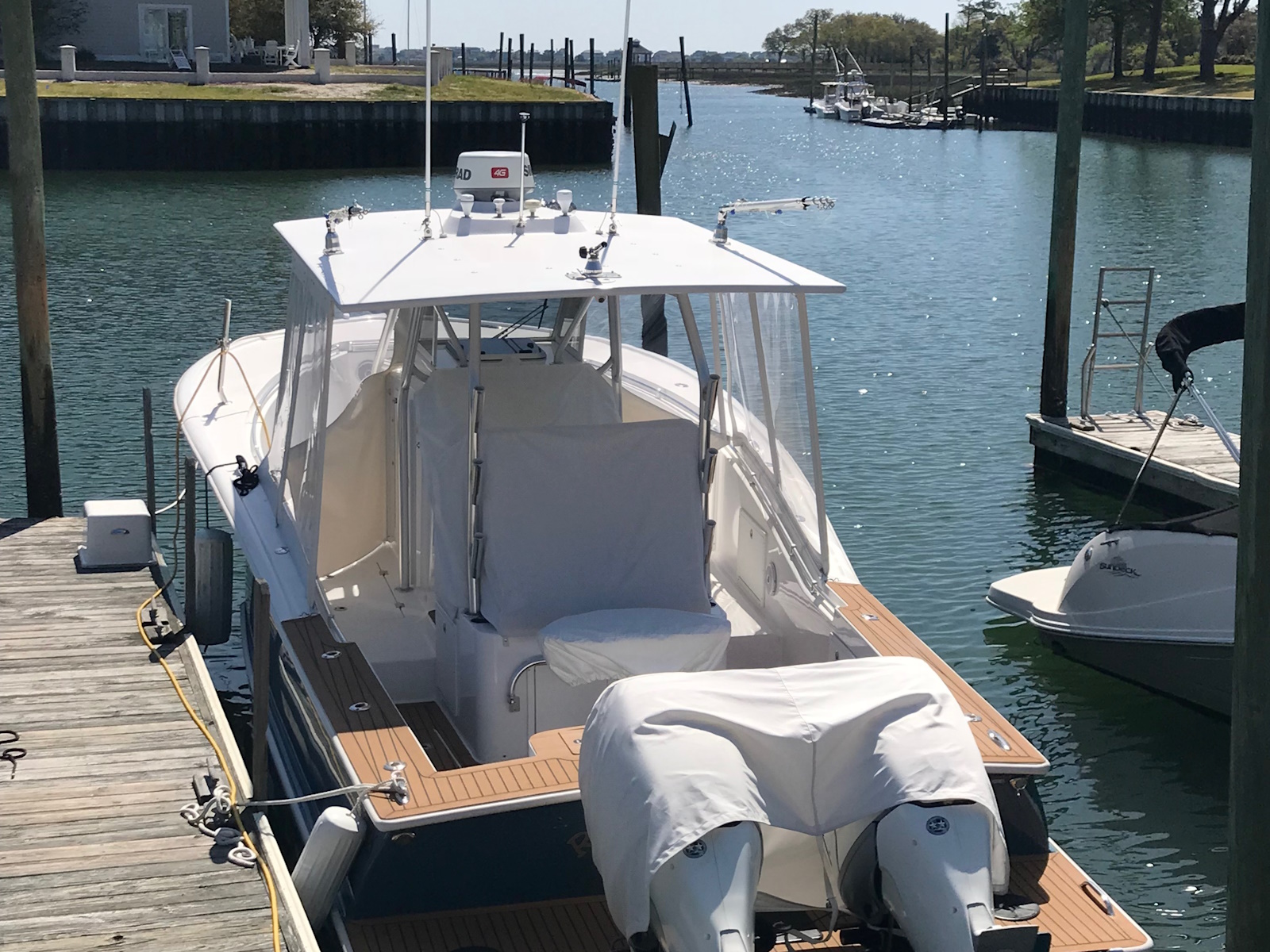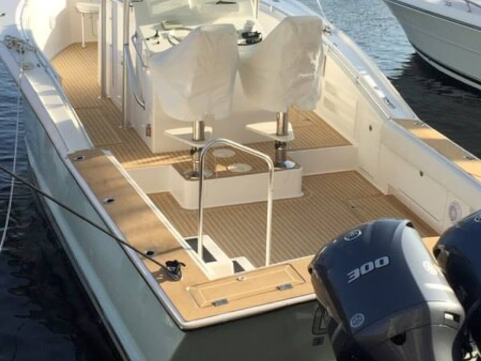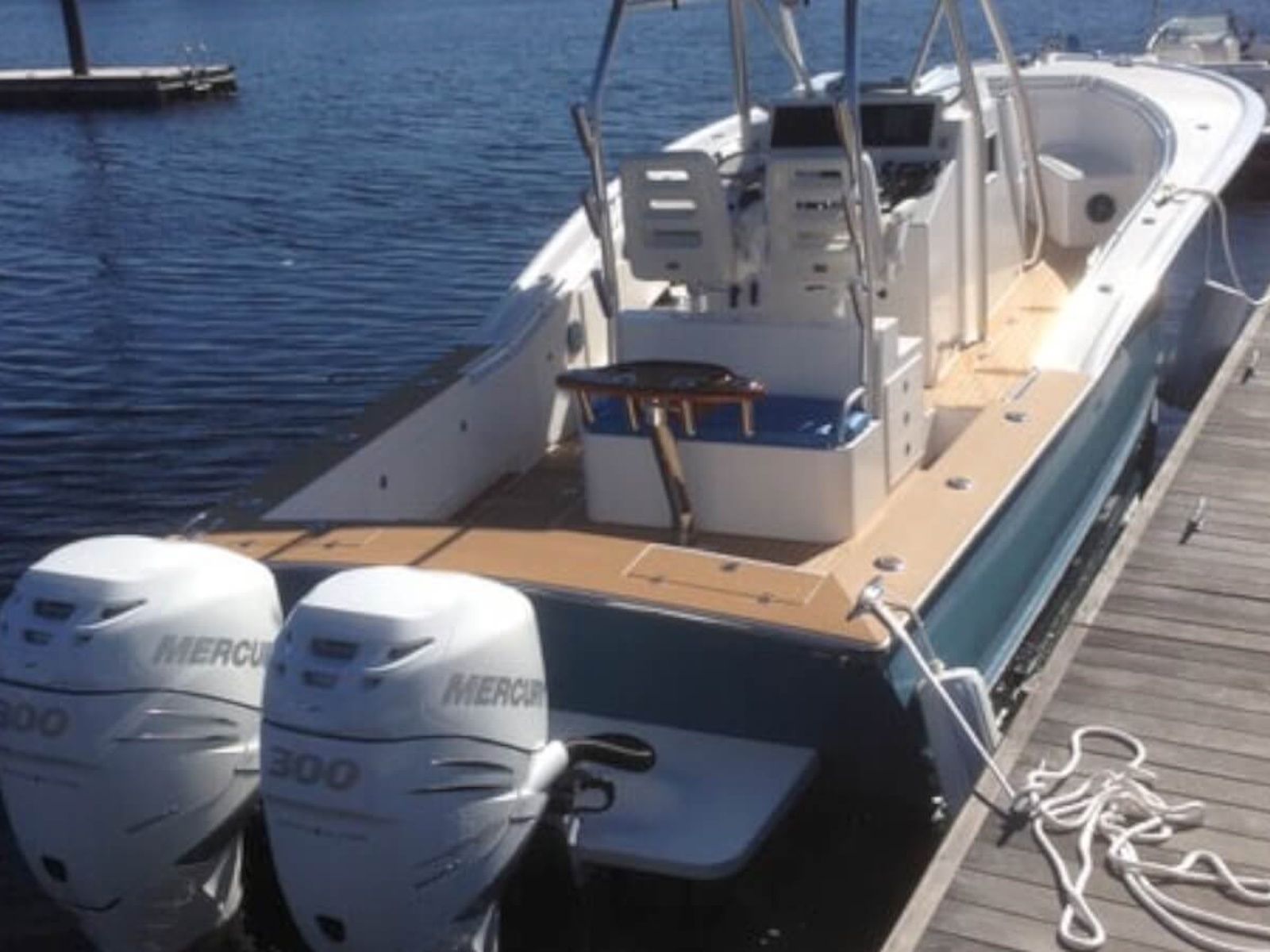 The 34 CC features a widebody console with T top standard. In the widebody console there is a luxury air conditioned cabin with private head that has a toilet and sink. Cabin features a small galley with refrigerator/freezer to port and a L shaped lounge that converts to a berth. There is a full entertainment package with TV, Blu-ray and stereo. Forward on the console there is a sun lounge. The foredeck is left clean for ease of fishing but forward seating is an option. The helm features triple helmseats and an aft facing bench/Tackle center. Below the helmseat base is a mechanical room which provides access to all the systems for service and inspection.