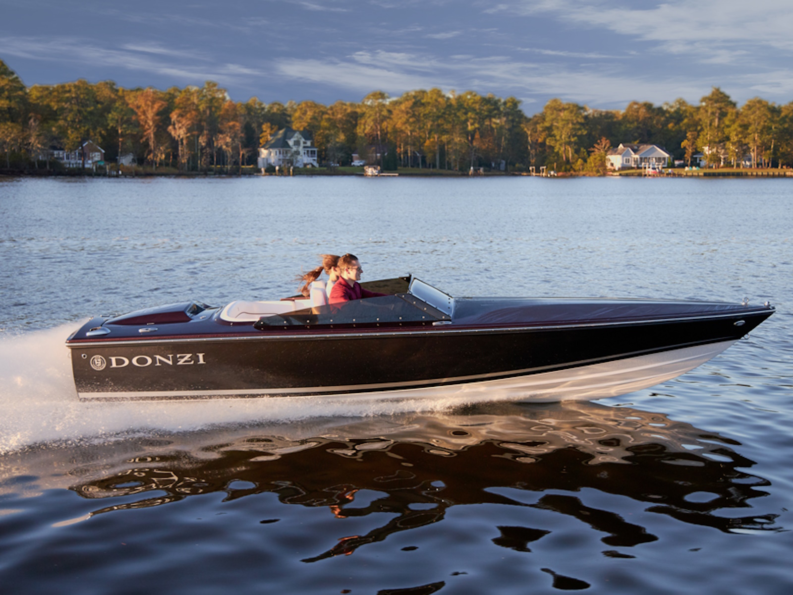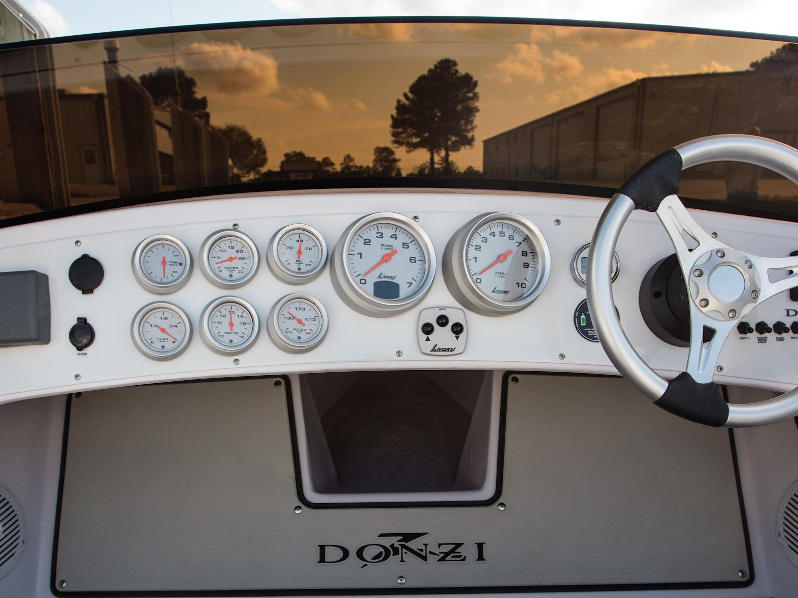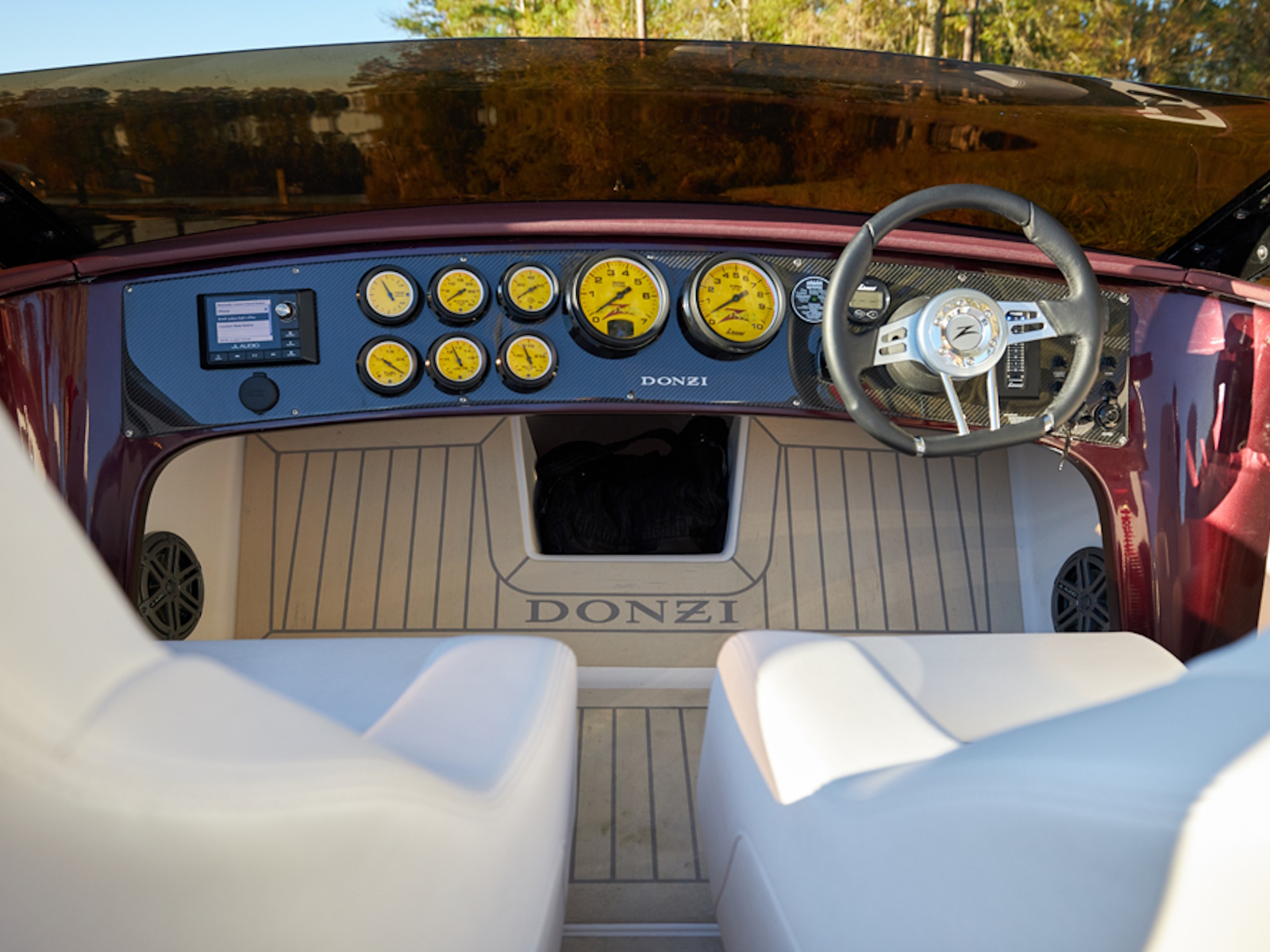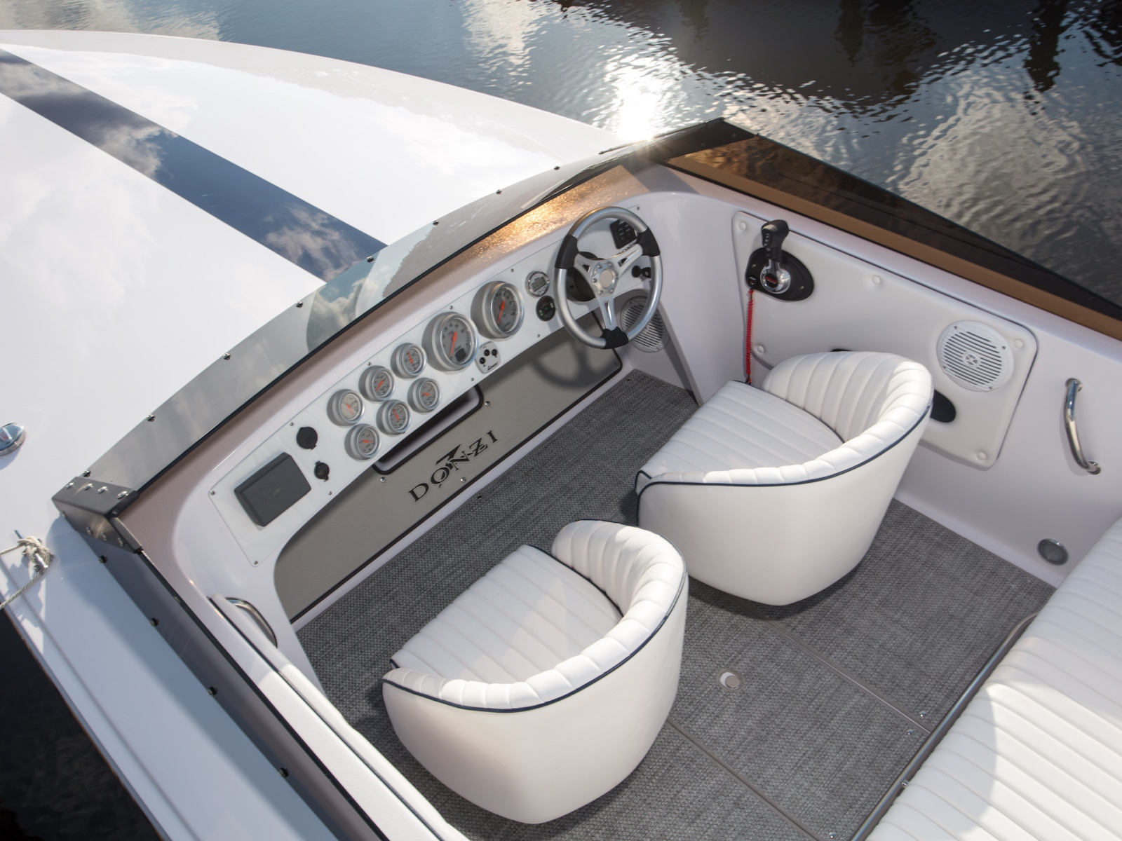 A certain head-turner, the legendary Donzi 22' Classic now includes a pad-keel bottom design, upgraded upholstery a next-generation dash and a Venturi windshield. In the engine compartment, you can rev all the way up to a Mercury Racing 565HP with Bravo 1 Short Sportmaster, ITS Gimbal and Steering, blueprinted bottom, Mercury 280 K-Plane Tabs, and a raised engine hatch. A high-performance Isotta steering wheel feels good to the touch. Marine Mat flooring is standard with Plasadeck custom flooring optional.